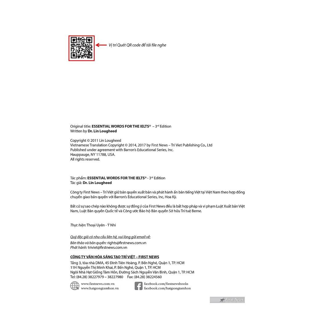 Barron's Essential Words for IELTS - Ấn bản lần 3 (600 từ vựng thiết yếu cho kỳ thi IELTS) sẽ giúp bạn làm quen với các từ vựng mà bạn sẽ tìm thấy trong phần đọc và nghe của bài thi IELTS (International English Language Testing System - Hệ thống Kiểm tra Tiếng Anh quốc tế). Khi số lượng từ mà bạn hiểu được lúc đọc và nghe tăng lên, thì vốn từ dùng để nói và viết cũng sẽ được cải thiện. Từ đó, trở thành một công cụ thiết yếu giúp bạn rèn luyện và đạt được điểm cao trong các kỳ thi IELTS.