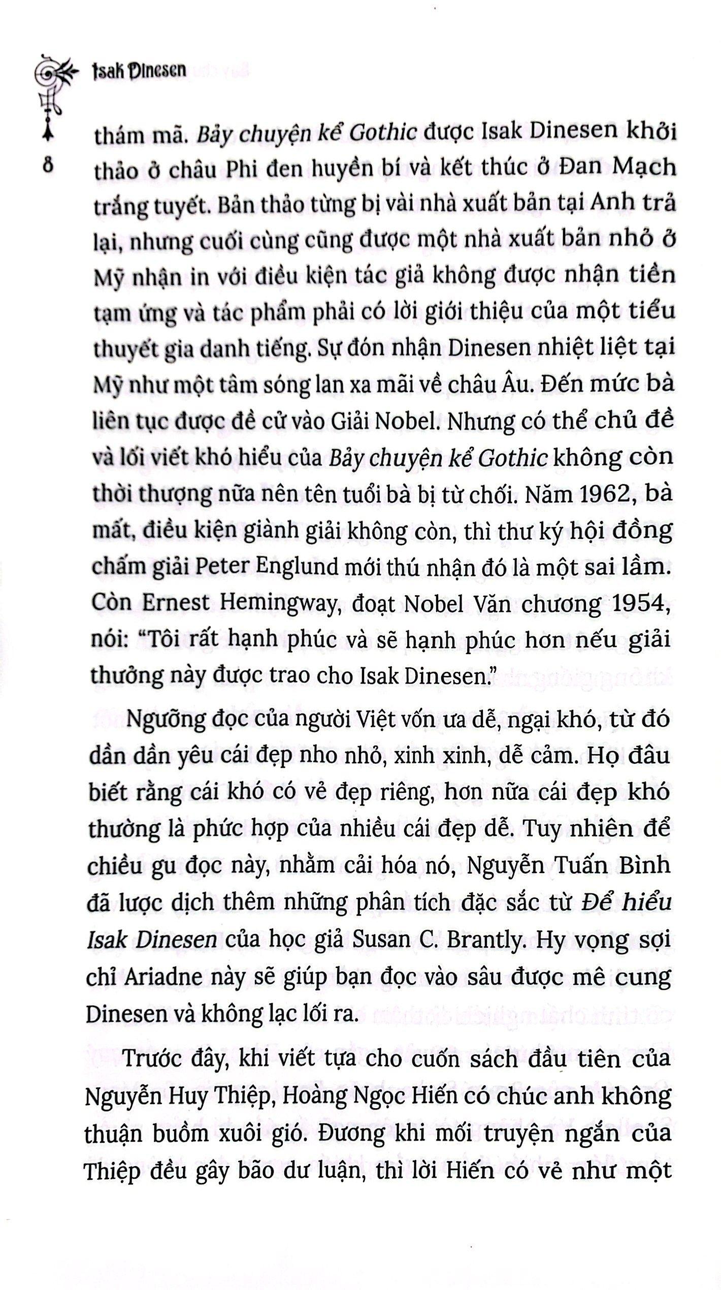 Khi nhắc tới nhà văn Đan Mạch Isak Dinesen, chắc hẳn bạn đọc Việt Nam sẽ nghĩ ngay tới “Châu Phi nghìn trùng” nổi tiếng – cuốn hồi ký của bà về 17 năm sống ở châu Phi – qua bản dịch ngọt ngào của dịch giả Hà Thế Giang. Nhưng có lẽ ít bạn đọc biết rằng chính tác phẩm đầu tay “Bảy chuyện kể Gothic” xuất bản năm 1934 ở Mỹ đã đưa Isak Dinesen trở thành một trong những nhà văn quan trọng nhất thế kỷ XX.