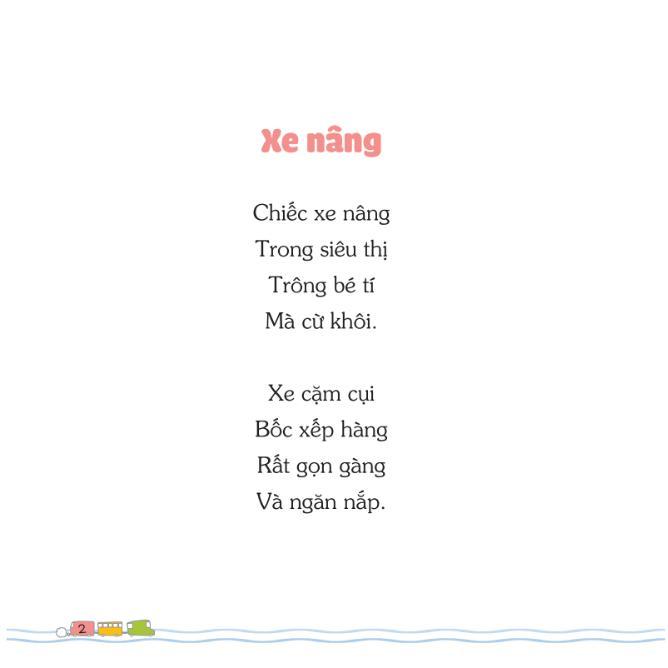 - Cảm nhận được những giá trị tốt đẹp trong cuộc sống qua những bài học nhẹ nhàng Những bài thơ đầy sắc màu mở ra thế giới ngôn ngữ Bé Học Nói Qua Thơ – Những Chiếc Xe Chăm Chỉ được thiết kế đặc biệt để giúp các bé từ 2 đến 6 tuổi tiếp cận với ngôn ngữ thông qua những bài thơ ngắn gọn, dễ hiểu và vô cùng sinh động. Mỗi bài thơ trong cuốn sách là một câu chuyện nhỏ, với những nhân vật gần gũi như những chiếc xe chăm chỉ, qua đó kích thích trí tưởng tượng và khả năng ngôn ngữ của bé. Với những vần điệu vui tươi, bé sẽ dễ dàng ghi nhớ và phát âm theo cách tự nhiên nhất. Điều này không chỉ giúp bé phát triển khả năng ngôn ngữ mà còn giúp rèn luyện sự tập trung và trí nhớ. Nội dung đặc sắc của cuốn sách Cuốn sách Bé Học Nói Qua Thơ – Những Chiếc Xe Chăm Chỉ bao gồm những bài thơ xoay quanh chủ đề phương tiện giao thông như: xe tải, xe buýt, xe cứu hỏa… Mỗi chiếc xe đều mang một câu chuyện riêng, đầy màu sắc và cảm xúc. Điểm đặc biệt của cuốn sách