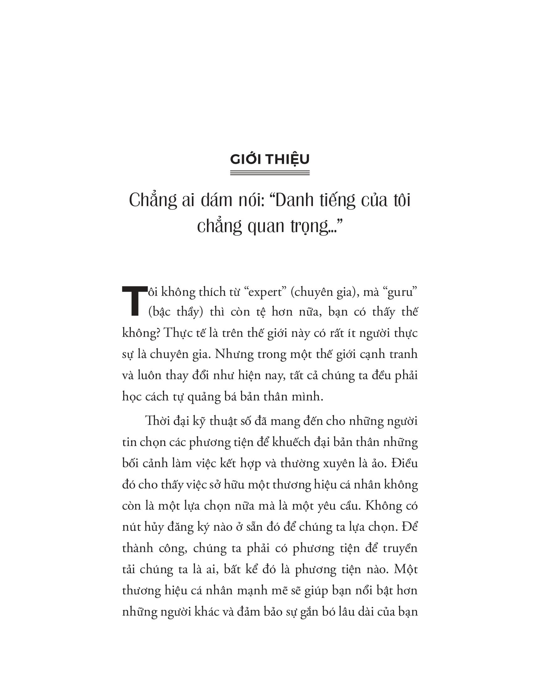 Vào thời điểm đọc cuốn sách này, trên cương vị là nhà sáng lập Pencil Group (), người cũng đang trong hành trình không ngừng nỗ lực xây dựng một công ty, một thương hiệu cá nhân gắn liền với triết lý sáng tạo, đổi mới, cam kết phục vụ cộng đồng, tôi nhận rằng để tạo dựng niềm tin và sự ảnh hưởng, bạn cần vượt qua ranh giới của chức danh công việc, và bước vào hành trình định thân. Và với tất cả những điều đó, cuốn sách này sẽ không chỉ là kim chỉ nam trong việc xây dựng thương hiệu cá nhân, hơn thế nó còn là nguồn cảm hứng để bạn khám phá tiềm năng của bản thân và dũng cảm bước ra khỏi vùng an toàn.