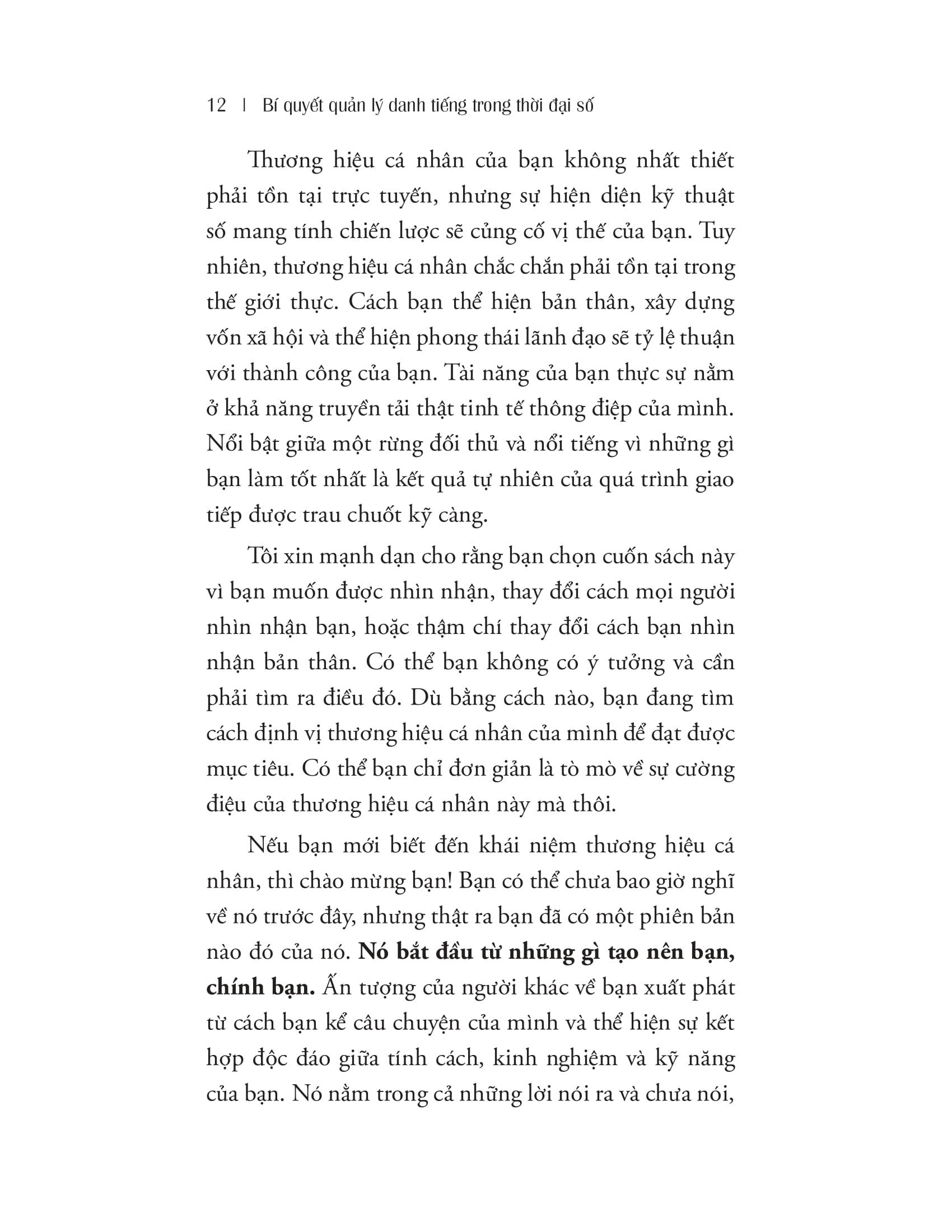 Có thể coi Bí quyết quản lý danh tiếng trong thời đại số là cuốn cẩm nang hướng dẫn độc giả xác định câu chuyện thương hiệu của riêng m.ình dựa trên kinh nghiệm, đam mê và mục tiêu nghề nghiệp.