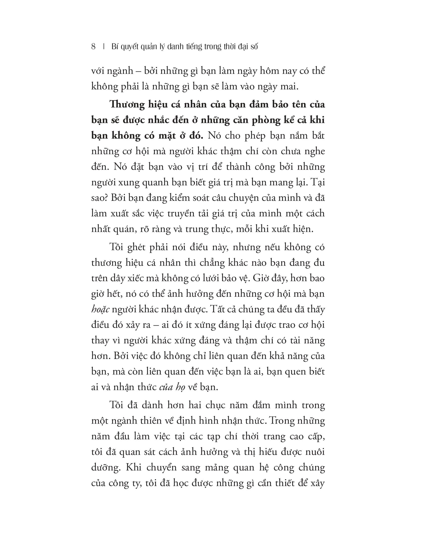Tôi nghĩ Bí quyết quản lý danh tiếng trong thời đại số đã vượt qua một cuốn sách kỹ năng và thực hành thông thường, với những bài rèn luyện thực tế, vừa đủ. Đây là cuốn sách về xây dựng và phát triển thương hiệu cá nhân đến từ chiến lược gia kỹ thuật số và tiếp thị thương hiệu sáng tạo trong thời kỳ người tiêu dùng mới. Từ trải nghiệm cá nhân với những thăng trầm điển hình trong nghề, tác giả viết lại câu chuyện định vị thương hiệu cá nhân kiểu mẫu với câu hỏi lớn: Tôi là ai? Cuốn sách này xứng đáng trở thành nguồn cảm hứng cho bất kỳ ai trong cuộc đời m.ình tin rằng: Luôn có một phiên bản xứng đáng với toàn bộ sự chân thành và nỗ lực tạo dựng của m.ình.