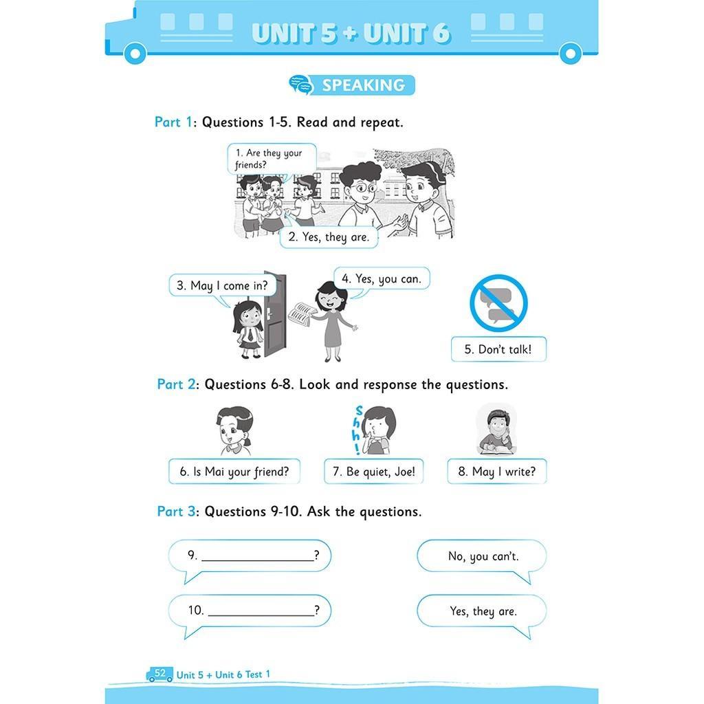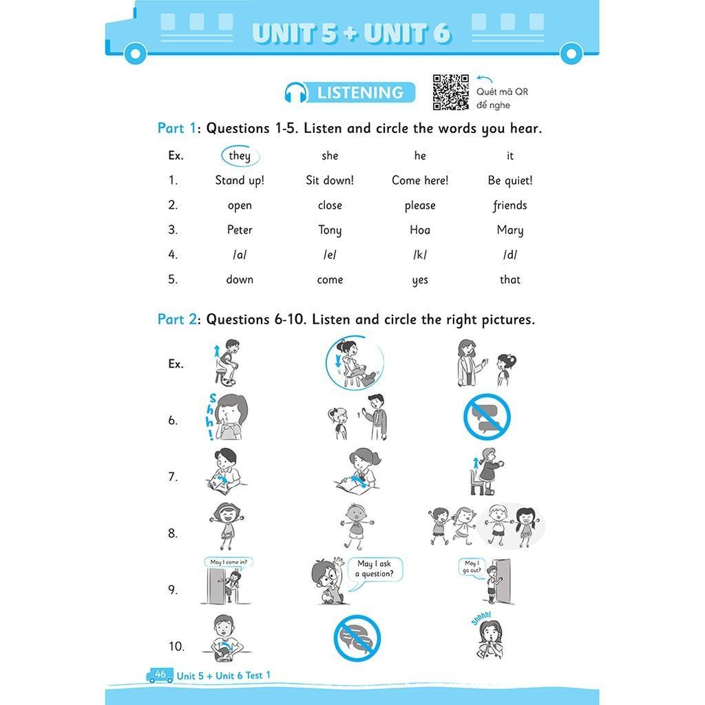 Cứ hai bài sẽ có 2 bài kiểm tra, tất cả các bài kiểm tra đều được thiết kế theo quy định thông tư mới nhất về kiểm tra môn Tiếng Anh tiểu học.