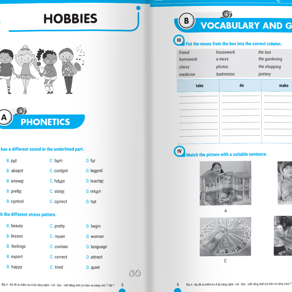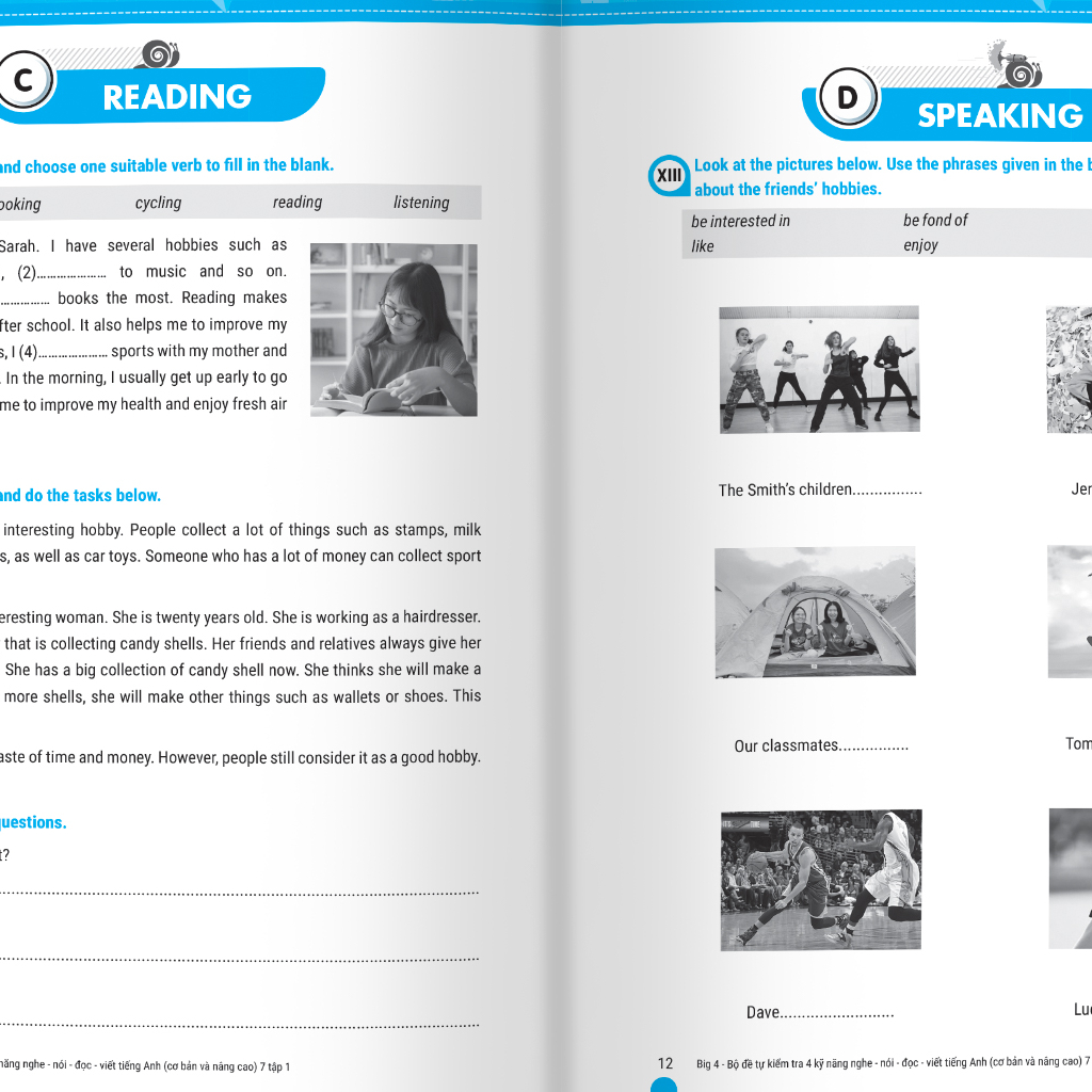 Bộ sách Big 4 - Bộ đề Tự kiểm tra 4 kỹ năng NGHE – NÓI – ĐỌC – VIẾT được biên soạn theo khung chương trình mới của Bộ Giáo dục và Đào tạo nhằm giúp các em học sinh Trung học cơ sở được củng cố và phát triển toàn diện các kỹ năng nghe, nói, đọc, viết tiếng Anh. ĐIỂM NỔI BẬT ĐẶC BIỆT CỦA SÁCH 1. Nội dung được biên soạn một cách khoa học, theo khung chương trình mới nhất của Bộ Giáo dục và Đào tạo Big 4 - Bộ đề Tự kiểm tra 4 kỹ năng NGHE – NÓI – ĐỌC – VIẾT được biên soạn theo chương trình mới của Bộ Giáo Dục và Đào Tạo. Đây là nguồn tài liệu hữu ích cho giáo viên, phụ huynh và các em học sinh bên cạnh bộ sách giáo khoa cơ bản. Cấu trúc của mỗi Unit gồm 6 phần A. Phonetics B. Vocabulary And Grammar C. Reading D. Speaking E. Listening F. Writing 2. Bài tập rèn luyện đa dạng, cơ bản và nâng cao Bài tập được phân chia theo 2 cấp độ, cơ bản và nâng cao. Hệ thống bài tập luyện 4 kỹ năng cơ bản giúp các em ôn tập kiến thức trên lớp; bài tập mở rộng, nâng cao để các em rèn luyện và làm quen với các kì kiểm tra, đánh giá. Các bài tập về 4 kỹ năng được liên kết với nhau theo logic bài học giúp cảm em cảm thấy tự tin và phát triển toàn diện kỹ năng nghe, nói, đọc, viết tiếng Anh 3. File nghe QR code hiện đại và tiện dụng Một điểm đặc biệt của bộ sách đó là tính hiện đại và sự tiện dụng khi các em không cần sử dụng CD để có được bài nghe. Bộ sách được tích hợp mã QR và mã Code giúp các em dễ dàng có được file nghe chỉ với 1 chiếc smartphone, giúp rút ngắn thời gian tìm file 4. Đáp án chi tiết: Hệ thống lời giải chi tiết, các em có thể dễ dàng kiểm tra và đánh giá năng lực bản thân MegaBook hi vọng rằng bộ sách Big 4 bộ đề tự kiểm tra 4 kỹ năng Nghe - Nói - Đọc - Viết tiếng Anh sẽ làm tăng thêm sự tự tin của các em học sinh với khả năng tiếng Anh của bản thân. Công ty phát hành Megabook