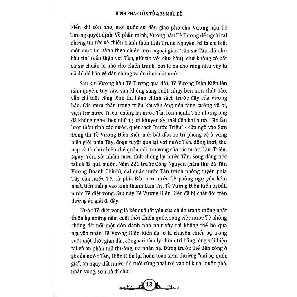 Binh Pháp Tôn Tử & 36 Mưu Kế Ba mươi sáu kế (Tam thập lục kế hay Tam thập lục sách) là một bộ sách tập hợp 36 sách lược quân sự của Trung Quốc cổ đại, ba mươi sáu kế bắt đầu xuất hiện từ thời Nam Bắc triều và tới thời nhà Minh thì được tập hợp thành sách. Tôn Tử binh pháp là gì? Đó chính là cuốn binh thư cổ có giá trị nhất của Trung Quốc, còn được gọi là Binh pháp Ngô Tôn Tử. Sách gồm 13 thiên: Kế thiên, Tác chiến, Mưu công, Hình thiên, Thế thiên, Hư thực, Quân tranh, Cửu biến, Hành quân, Địa hình, Cửu thiên địa, Hỏa công và Dụng gián, được viết bằng cổ văn tiền Tần, với hơn 5.900 chữ Hán. Tam thập lục kế (36 kế) được thấy sớm nhất trong các câu chuyện thời Xuân Thu - Chiến Quốc. Về sau, nhiều đời, nhiều người đã ghi chép, hiệu đính lại cuốn sách đó. Có thể nói, hai cuốn sách này đã tập hợp lại