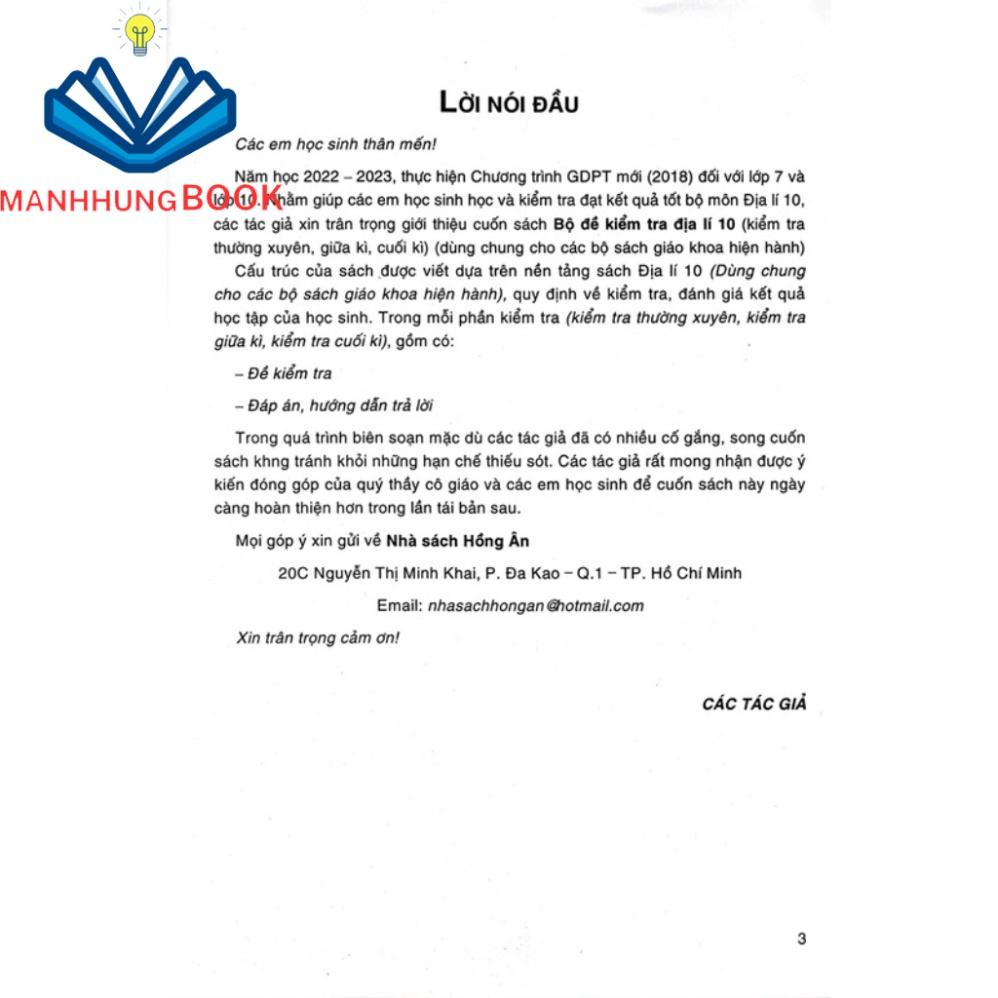 Năm học 2022 – 2023, thực hiện Chương trình GDPT mới (2018) đối với lớp 7 và lớp 10. Nhằm giúp các em học sinh học và kiểm tra đạt kết quả tốt bộ môn Địa lí 10, các tác giả xin trân trọng giới thiệu cuốn sách Bộ đề kiểm tra địa lí 10 (kiểm tra thường xuyên, giữa kì, cuối kì) (dùng chung cho các bộ sách giáo khoa hiện hành).