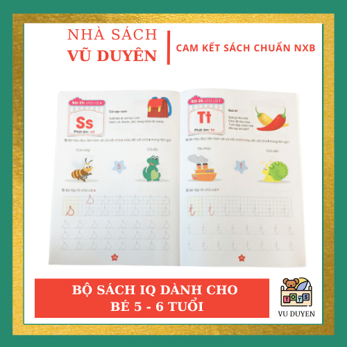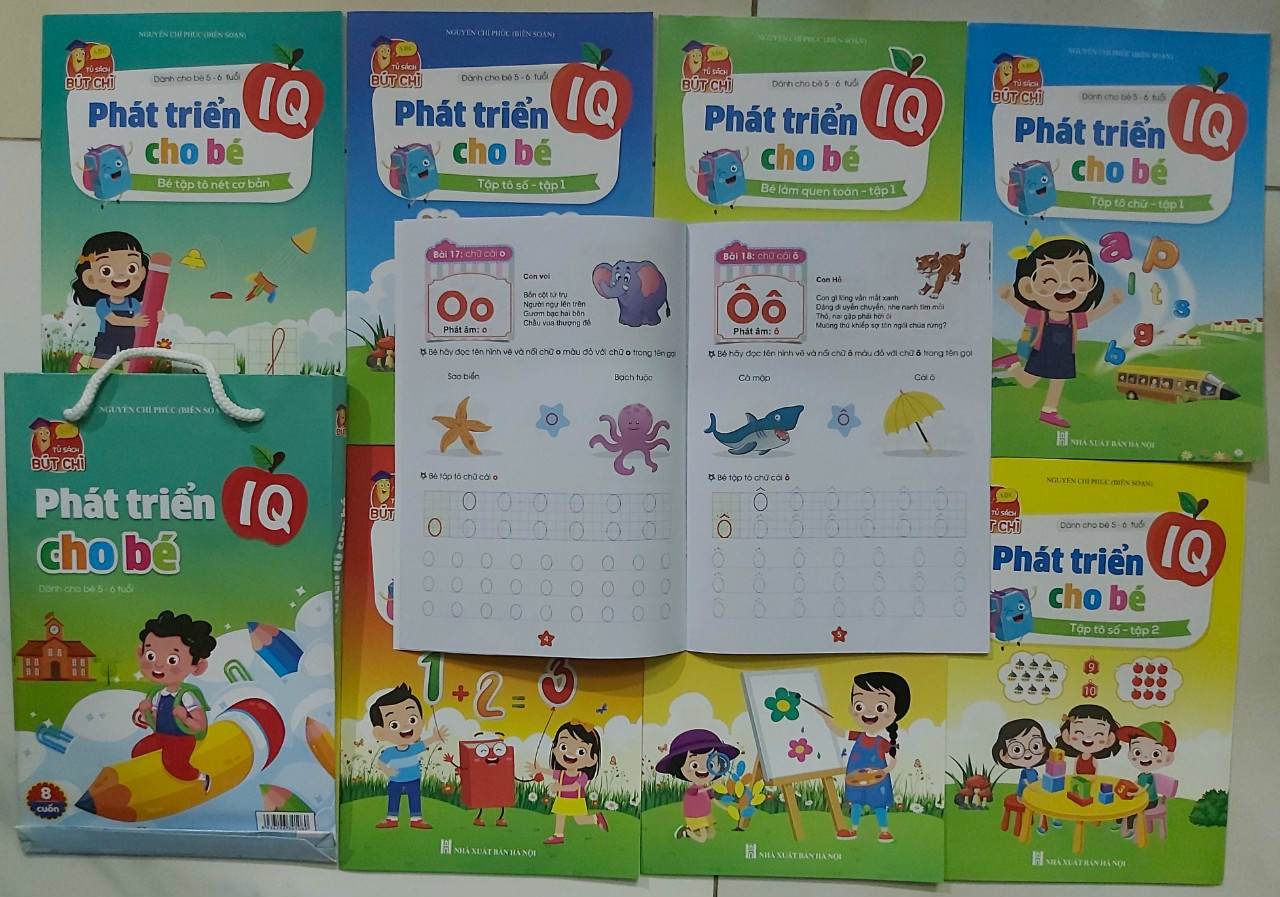 GIỚI THIỆU ❝ Bộ sách phát triển IQ cho bé 5 đến 6 tuổi - Combo 8 quyển ❞ DÀNH CHO ĐỘC GIẢ NHÍ ✿ IQ là viết tắt của ""Intelligence Quotient"", thường gọi là chỉ số thông minh. Nó chỉ khả năng nhận biết các sự vật hiện tượng và vận dụng kiến thức để giải quyết vấn đề của con người. Trí tuệ bao gồm rất nhiều mặt, như: khả năng quan sát, khả năng ghi nhớ, trí tưởng tượng, năng lực tư duy, khả năng ứng biến... ✿Ở lứa tuổi mầm non, trẻ càng ngày càng đam mê khám phá về màu sắc, kích cỡ, hình dạng và qui luật sắp xếp của sự vật; từng bước hình thành khái niệm số học và khả năng đếm. Bên cạnh đó, năng lực ngôn ngữ của trẻ cũng từng bước chuyển sang giai đoạn tiếp thu ngôn ngữ quy chuẩn. ✿ Bộ sách Phát triển IQ 5-6 tuổi giúp bé hoàn thiện những kỹ năng cần thiết như: tập tô chữ, tô số, bé làm quen với toán, bé tập so sánh,… cho bé bước đầu làm quen với toán và tiếng việt