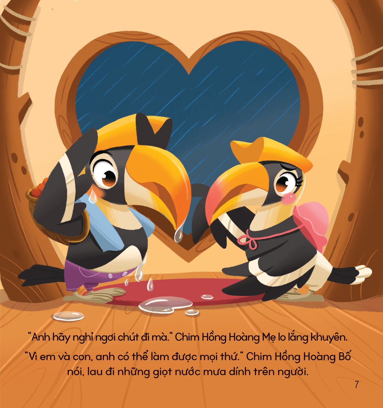 Một ngày nọ, trong lúc đang đi dạo, Chim Hồng Hoàng Mẹ đã bị cơn dông cuốn đi mất. Từ đó, Chim Hồng Hoàng Bố vừa phải một mình chăm sóc con nhỏ vừa tranh thủ bay đi khắp nơi để tìm vợ. Dù thời gian trôi qua bao lâu và nhiều loài động vật khác khuyên nhủ thế nào, ông vẫn nhất quyết không bỏ cuộc. Liệu cuối cùng Chim Hồng Hoàng Bố có tìm được vợ mình không nhỉ? Chúng mình hãy cùng theo dõi câu chuyện thú vị và đầy cảm động này để tìm ra câu trả lời nhé! Thông qua câu chuyện, em sẽ còn học hỏi được nhiều đức tính tốt đẹp từ Chim Hồng Hoàng Bố nữa đấy.