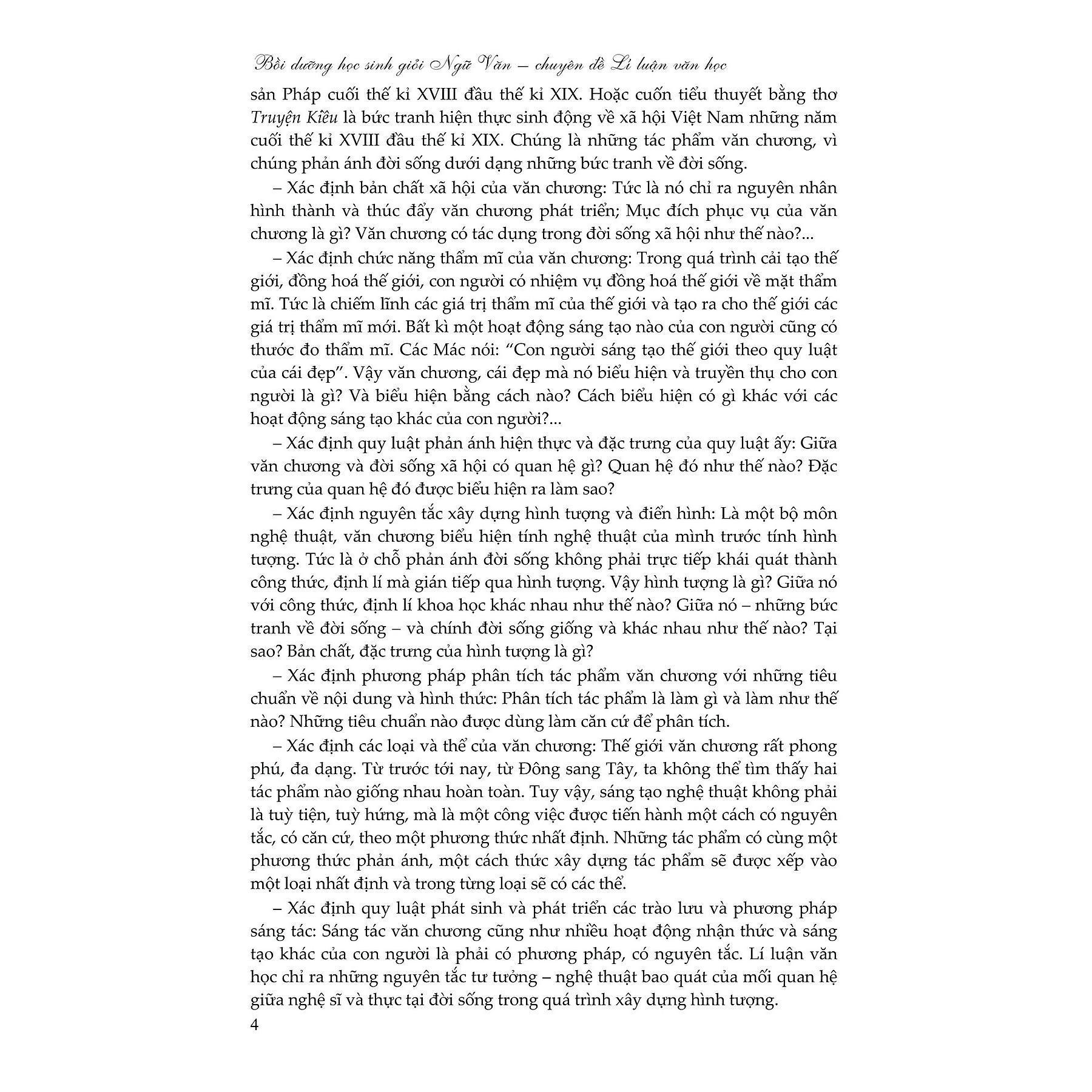 Đây là cuốn sách được nhóm biên soạn tập hợp những vấn đề cơ bản về lí luận văn học. Cuốn sách này được viết bởi nhiều giọng điệu, nhiều mức độ khai thác giá trị của văn chương để đáp ứng trình độ của đối tượng học sinh giỏi THCS & THPT. Sau mỗi bài học là câu hỏi và bài tập để học sinh tham khảo và vận dụng. Với nội dung khá phong phú, đa dạng như vậy thì đây là cách “Học khôn ngoan mà không gian nan”. Người biên soạn hi vọng đây sẽ là cuốn sách bổ ích đối với giáo viên và các em học sinh. Bể học là mênh mông vô tận, conngười chỉ là một giọt nước trong đại dương kiến thức. Người biên soạn khát khao, mong mỏi các em vượt khó để vươn lên học giỏi bộ môn Ngữ văn.
