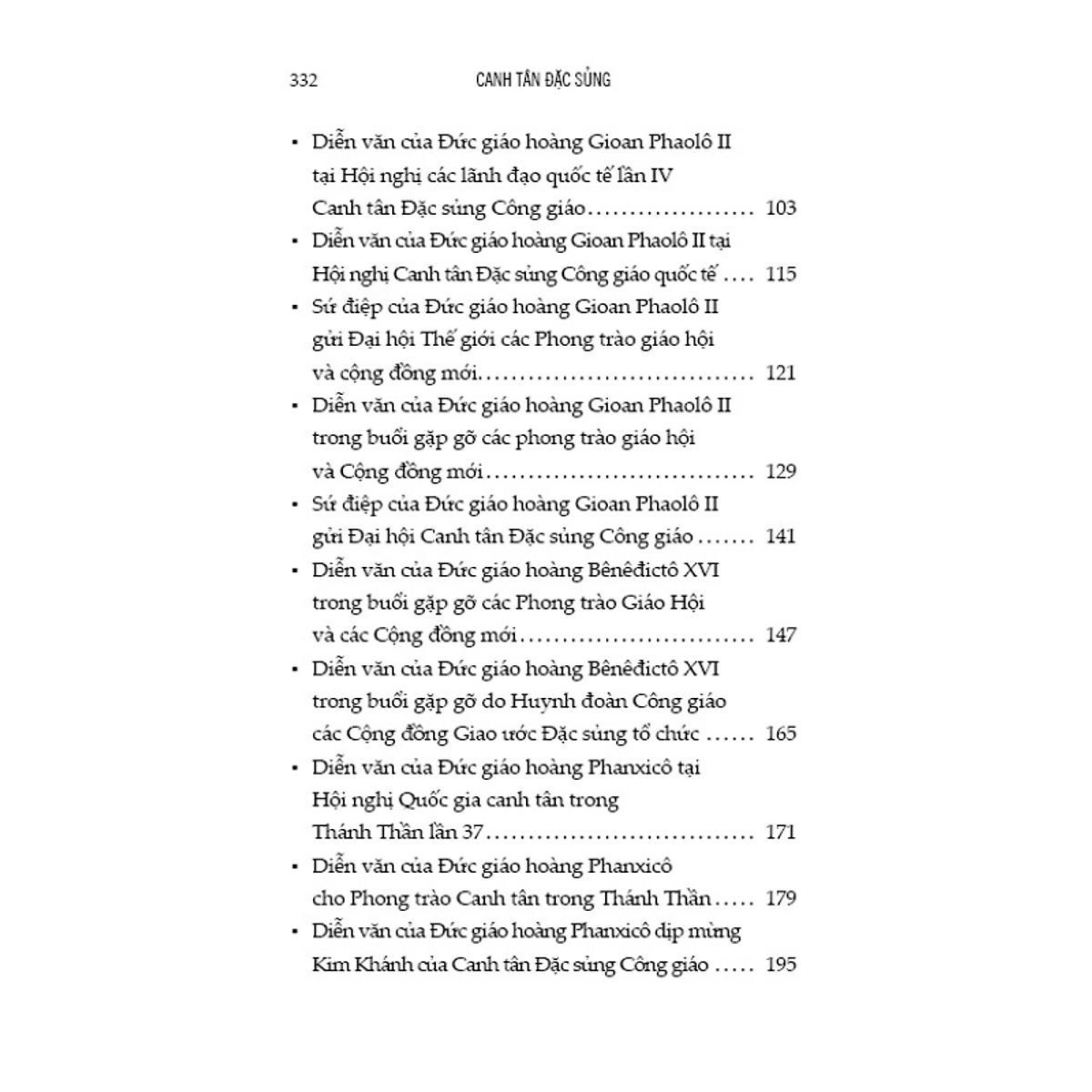 Cuốn sách này tổng hợp một số tài liệu của huấn quyền Giáo Hội Công Giáo, liên quan đến điều mà chúng ta thường gọi là “Canh tân Đặc sủng”; bên cạnh những tài liệu của huấn quyền, cũng có một vài tài liệu khác được giới thiệu nhằm trình bày thêm về một số điểm. Cuốn sách ước mong mang lại cho độc giả những hướng dẫn, chỉ dạy của huấn quyền về các phong trào, hiệp hội giáo hội và các cộng đồng mới, đặc biệt là về Canh tân Đặc sủng Công giáo, để giúp chúng ta có một cái nhìn đúng theo như đường hướng của Giáo Hội. Cuốn sách này gồm có ba phần.