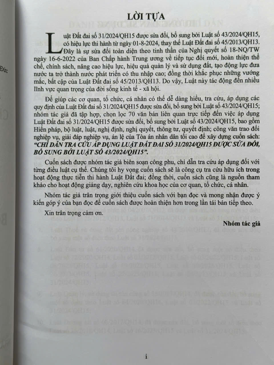 - Cuốn sách được biên soạn chỉ dẫn theo từng điều luật. Nội dung của Luật Đất đai số 31/2024/QH15 được sửa đổi, bổ sung bởi Luật số 43/2024/QH15 được trình bày với kiểu chữ không in nghiêng. Nội dung chỉ dẫn được trình bày liền kề sau từng điều luật tương ứng với kiểu chữ in nghiêng.
