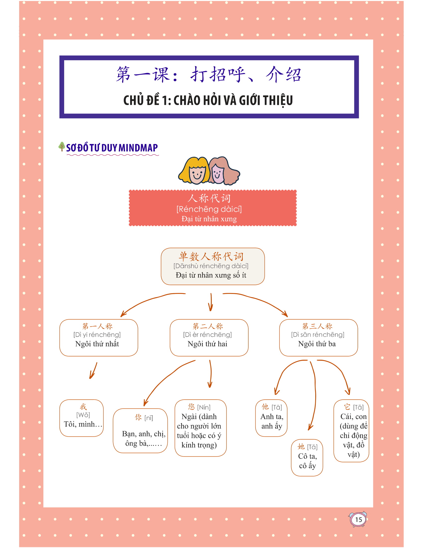 Phần này tập hợp các từ vựng với những chủ đề thông dụng kèm theo các cấu trúc câu kèm ví dụ thường dùng nhất trong giao tiếp hằng ngày như: chào hỏi, gia đình, hoạt động hằng ngày, công việc, ăn uống, giải trí,… Trình bài theo sơ đồ tư duy mindmap giúp tạo hứng thú và tăng khả năng ghi nhớ cho người học.