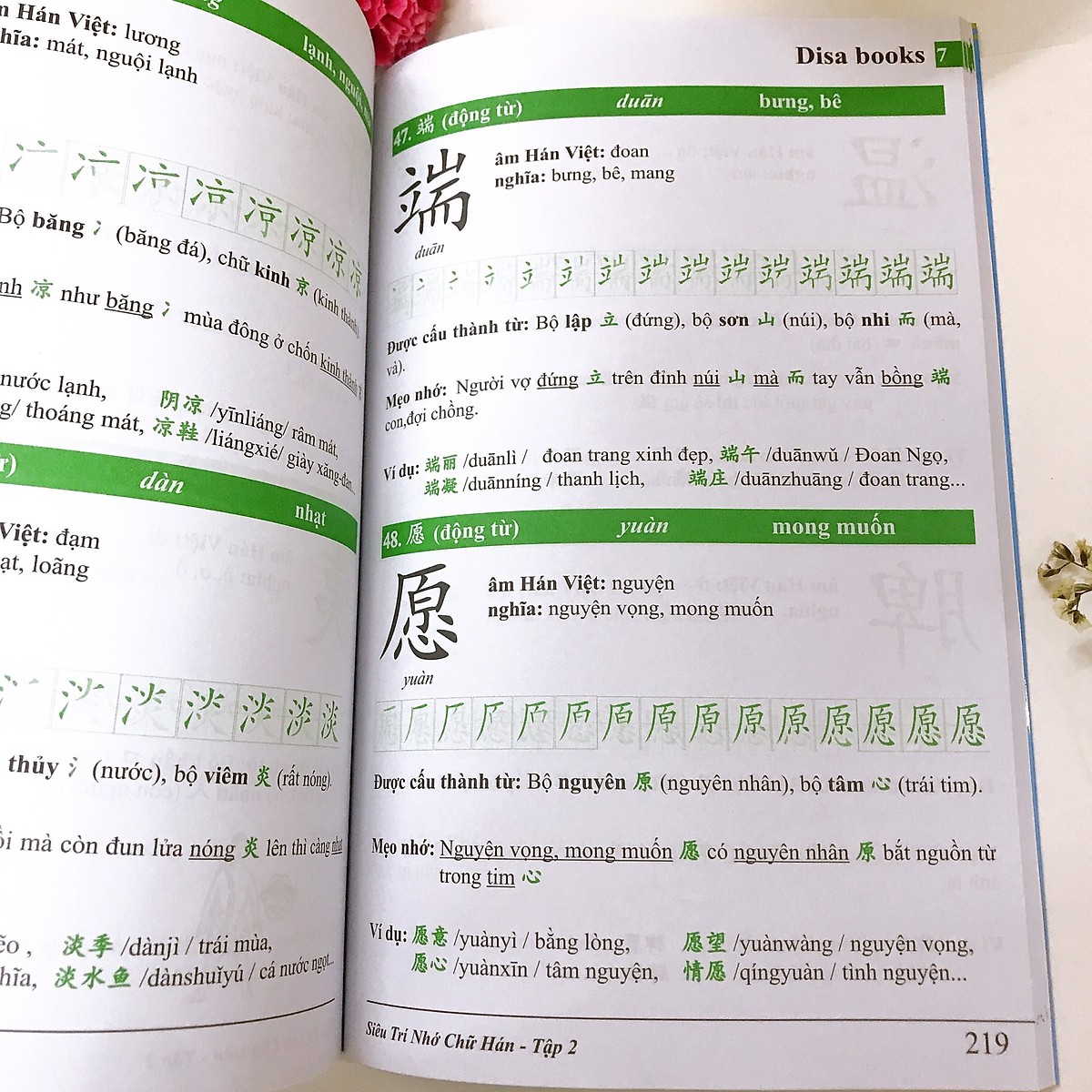 1. Siêu trí nhớ chữ Hán tập 02 Nội dung sách: Giúp bạn dễ dàng nhớ ngay 1000 chữ Hán chỉ sau 2 tháng thông qua mẹo nhớ và hình ảnh dễ hiểu. Tác giả: Diệu Hồ – Phạm Thành Luân Số trang: 268 Năm xuất bản: 2019 Nhà Xuất Bản: Đà Nẵng Cách nhớ chữ Trung Quốc (chữ Hán) a. Nhớ chữ Hán bằng các bộ thủ Bộ thủ chính là cách nhớ chữ Hán hiệu quả , mỗi bộ thủ trong tiếng Hán lại biểu hiện một hiện tượng sự vật riêng. Nhớ được các bộ thủ đó chính là đã nhớ cách viết tiếng Trung như thế nào. Và việc còn lại chính là ghép các bộ thủ đó với nhau để tạo nên được một chữ hoàn chỉnh. vd: chữ 安 Ở trên là bộ 宀 miên => mái nhà mái che, Ở dưới là bộ女 nữ => nữ giới, con gái, đàn bà. Người phụ nữ ở dưới trong nhà thì rất “an” toàn. Ví dụ: 安全 (Ānquán) – An Toàn. Mẹo nhỏ cho những người mới học viết tiếng Trung có thể nhớ đó là dùng các mảnh giấy nhớ, ghi lại những bộ thủ hay những từ mới bằng việc tập viết tiếng Trung. Để những mảnh giấy nhớ đó ở những nơi dễ thấy. Việc nhìn liên tục đó sẽ giúp bạn vừa có thể nhớ chữ vừa có thể nhớ từ. b. Cách nhớ chữ Hán qua thơ Các từ chữ Hán được học bằng cách gieo vần nhịp để người học nhớ chữ Hán dễ hơn như: “Chim chích mà đậu cành tre Thập trên tứ dưới đè chữ tâm” (Chữ Đức) Hay: “Tai nghe miệng nói đít làm vua”. (Chữ Thánh) Nhớ chữ Hán bằng cách vẽ lại những từ đấy. Nhớ các nét, mô phỏng lại và vẽ, đây là một trong những cách rất tốt để nhớ chữ Hán Chữ Hán có hai cách viết là giản thể và phồn thể. Đa phần các giáo trình tiếng Trung đều là chữ giản thể do đó rất nhiều trường hợp đã gặp lúng túng khi tiếp xúc với chữ phồn thể. Nếu để ý thì cách chữ phồn thể có cách viết chỉ khác chữ giản thể một chút. Trong quá trình học, đừng ngần ngại mà nhờ giáo viên chỉ hướng dẫn cách viết chữ phồn thể (viết tiếng trung) nếu công việc của bạn phải tiếp xúc với kiểu chữ này.