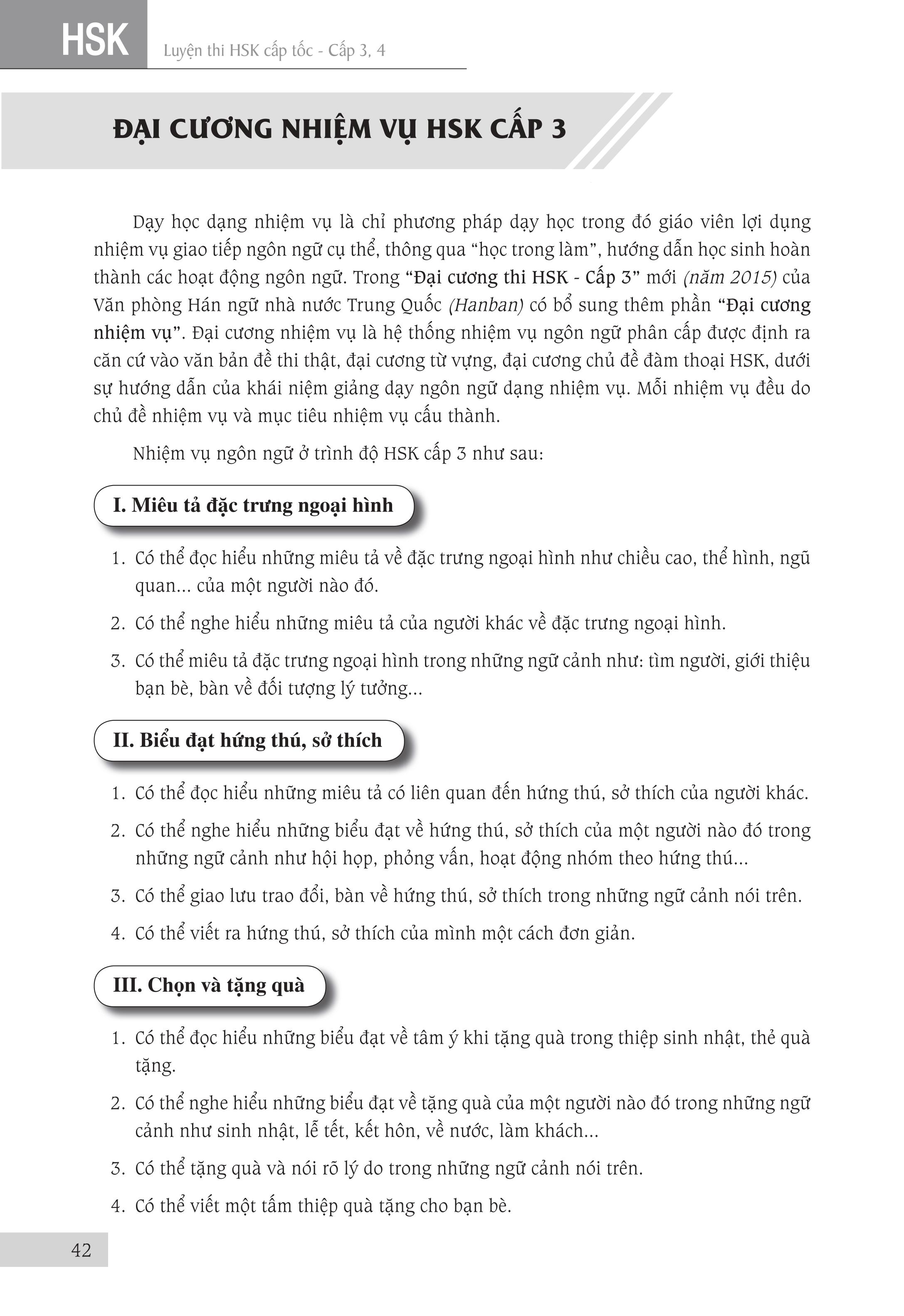 Luyện thi HSK cấp tốc cấp 3+4 Tác giả: Trương Văn GIới & Lê Khắc Kiều Lục Nhà xuất bản Đại Học Quốc Gia TPHCM Số trang: 424 Kích thước: 18.5cm x 26.5cm x 2cm Cân nặng: 570g Năm xuất bản: 2018 Đầu tiên xin được thuyết minh về chữ “cấp tốc” mà chúng tôi dùng trong tên của bộ sách. “Cấp tốc” không phải theo ý nghĩa đơn giản là nhanh và dễ dàng, không cần phải học nhiều mà cũng có thể thi đậu. Ý nghĩa của từ “Cấp tốc” mà chúng tôi hướng đến khi biên soạn bộ sách này là giúp người học nắm vững toàn bộ kiến thức của kỳ thi của một cách nhanh nhất mà vẫn bảo đảm kết quả tốt nhất. Người học vẫn phải làm việc cật lực để chuẩn bị tốt cho kỳ thi mới hy vọng có được kết quả khả quan. Kỳ thi HSK do Văn phòng Hán ngữ nhà nước Trung Quốc (gọi tắt là HANBAN) tổ chức. HANBAN đã xây dựng chuẩn kiến thức (từ vựng, điểm ngôn ngữ, chủ đề đàm thoại …) cho từng cấp độ, từ đó đưa ra đề thi mẫu tương ứng cho cấp độ thi đó. Như vậy, Đề cương và Đề thi mẫu của HANBAN chính là tài liệu chuẩn để thí sinh ôn luyện, giáo viên và các trường giảng dạy cho kỳ thi HSK. Nó cũng là đề cương để các tác giả, nhà xuất bản và các đơn vị biên soạn và xuất bản các tài liệu cho kỳ thi này. Để đạt mục tiêu “cấp tốc” đã giải thích ở trên, chúng tôi dựa vào Đề cương và Đề thi mẫu của HANBAN, cũng như những tài liệu luyện thi HSK của Trung Quốc để biên soạn bộ sách này. Từng phần của bài thi được giới thiệu qua một cấu trúc thống nhất như sau: I. Đặc điểm dạng đề: Phần này giới thiệu cấu trúc, đặc điểm và cách làm dạng bài thi này. Ở đề thi viết còn giới thiệu cách chấm điểm của dạng đề. Rõ ràng là để làm bài thi tốt, đầu tiên là phải nắm vững đề thi và biết cách làm loại đề thi đó. II. Những lỗi thường gặp: Chúng tôi tổng hợp những lỗi thường gặp của thí sinh khi làm dạng đề thi này. Học tập từ sai lầm là cách cực kỳ hiệu quả để tránh lặp lại những sai lầm của những người đi trước đã gặp phải khi làm bài. III. Trọng điểm thi, cách thức và kỹ xảo làm bài: Đây là phần quan trọng nhất của tài liệu Phần trọng điểm thi giới thiệu những trọng tâm mà dạng đề thi tập trung vào. Liên quan đến trọng điểm thi này, chúng tôi đã hệ thống hóa các điểm ngôn ngữ, công thức hóa các cấu trúc ngữ pháp cũng như tập hợp các từ ngữ có liên quan. Tiếp theo, người học sẽ được giới thiệu về cách thức, kỹ xảo làm bài. Cuối cùng là Mục phân tích ví dụ, Phần này được chúng tôi biên soạn hết sức công phu vì biết rằng những lý thuyết, những phân tích ở phần trọng điểm thi, cách thức kỹ xảo làm bài sẽ rất khó được nắm bắt nếu không có những ví dụ cụ thể. Những ví dụ được sử dụng được lấy từ các đề thi, ưu tiên lấy từ đề thi mẫu của HANBAN, để minh họa cho những vấn đề đã được giới thiệu ở phần trọng điểm thi và cách thức kỹ xảo làm bài.