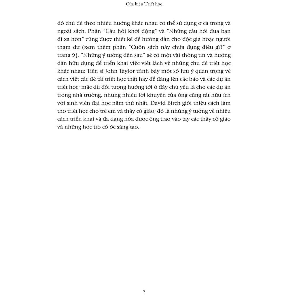 4. Ngôn ngữ và ý nghĩa hay Có thể nói gì về cái hiện hữu Cửa hiệu Triết học dành cho những ai thích chủ động đắm mình vào những ý tưởng hơn là thụ động đón nhận thông tin. Cuốn sách này bao gồm những bài viết cho nhiều độ tuổi và độ tuổi có thể bắt đầu đọc được ghi ngay dưới tựa mỗi bài viết. Cũng có thể có những độc giả cụ thể hơn quan tâm đến cuốn sách này như: Giáo viên và lớp học; Các khóa học triết, các nhóm hội thảo chuyên đề ở đại học và trợ giảng; Các nhóm đọc triết hay nhóm thảo luận; các nhóm trẻ và các nhóm ở nhà thờ; Cha mẹ với con cái và các câu lạc bộ triết học ngoài trường lớp; hoặc những cá nhân quan tâm và yêu thích triết học. Cuốn sách này được viết bởi Peter Worley và các nhà triết học từ khắp nơi trên thế giới.