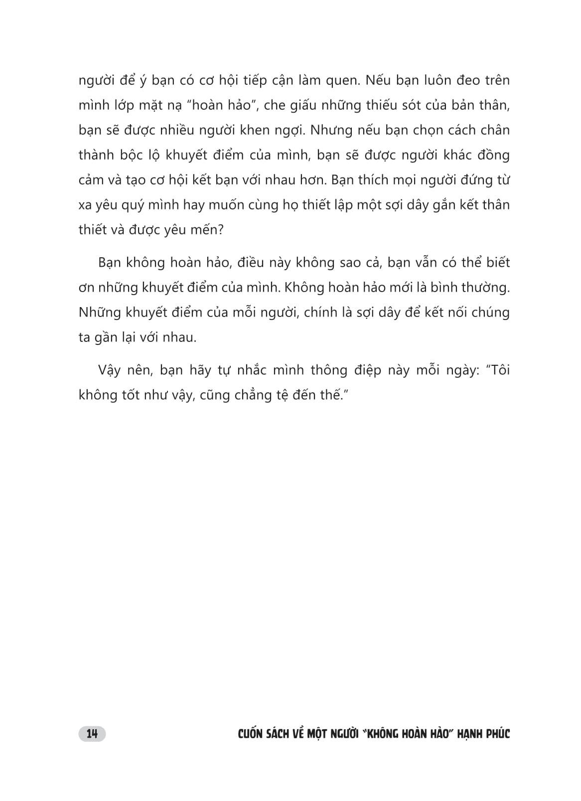 Cuốn sách về một người “không hoàn hảo” hạnh phúc mang đến những hiểu biết sâu sắc về bản chất con người; bộc lộ vô vàn mâu thuẫn, bất an của một thế giới hào nhoáng đẹp đẽ. Thông qua các góc nhìn độc đáo của tác giả, bạn sẽ được khám phá một cách trực tiếp và làm sáng tỏ nhiều khía cạnh khác nhau trong cuộc sống: tương lai, mối quan hệ, gia đình,… những điều mà bạn đang phải chật vật đối mặt.