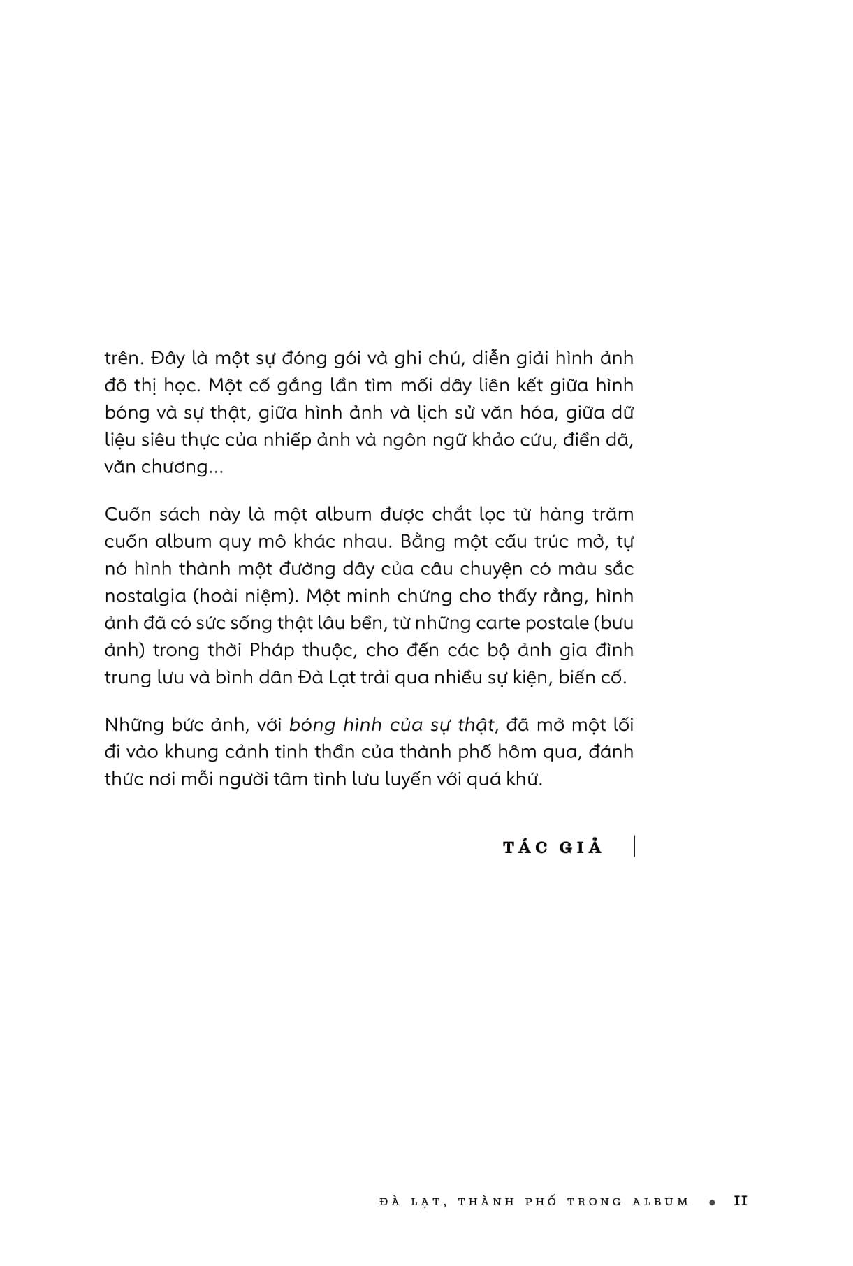 Hình ảnh tư liệu vi lịch sử cùng những câu chuyện dẫn giải vừa cẩn trọng vừa bay bổng làm cho Đà Lạt ngày hôm qua được tái hiện trên từng trang sách, hướng đến sự giao thoa ký ức, suy tư và xúc cảm với nhiều người gắn bó, yêu mến thành phố này.