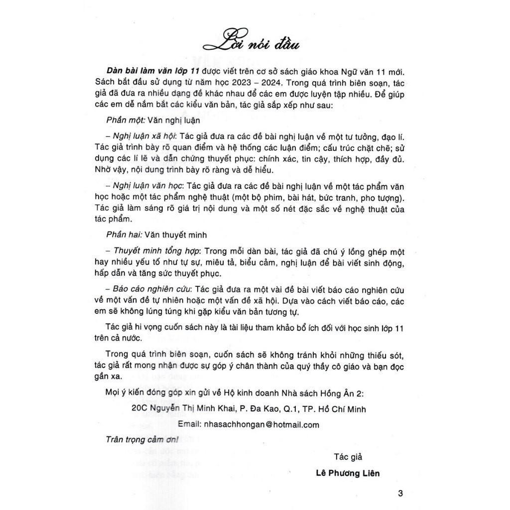 Dàn bài làm văn lớp 11 được viết trên cơ sở sách giáo khoa Ngữ văn 11 mới. Sách bắt đầu sử dụng từ năm học 2023 – 2024. Trong quá trình biên soạn, tác giả đã đưa ra nhiều dạng đề khác nhau để các em được luyện tập nhiều. Để giúp các em dễ nắm bắt các kiểu văn bản, tác giả sắp xếp như sau: