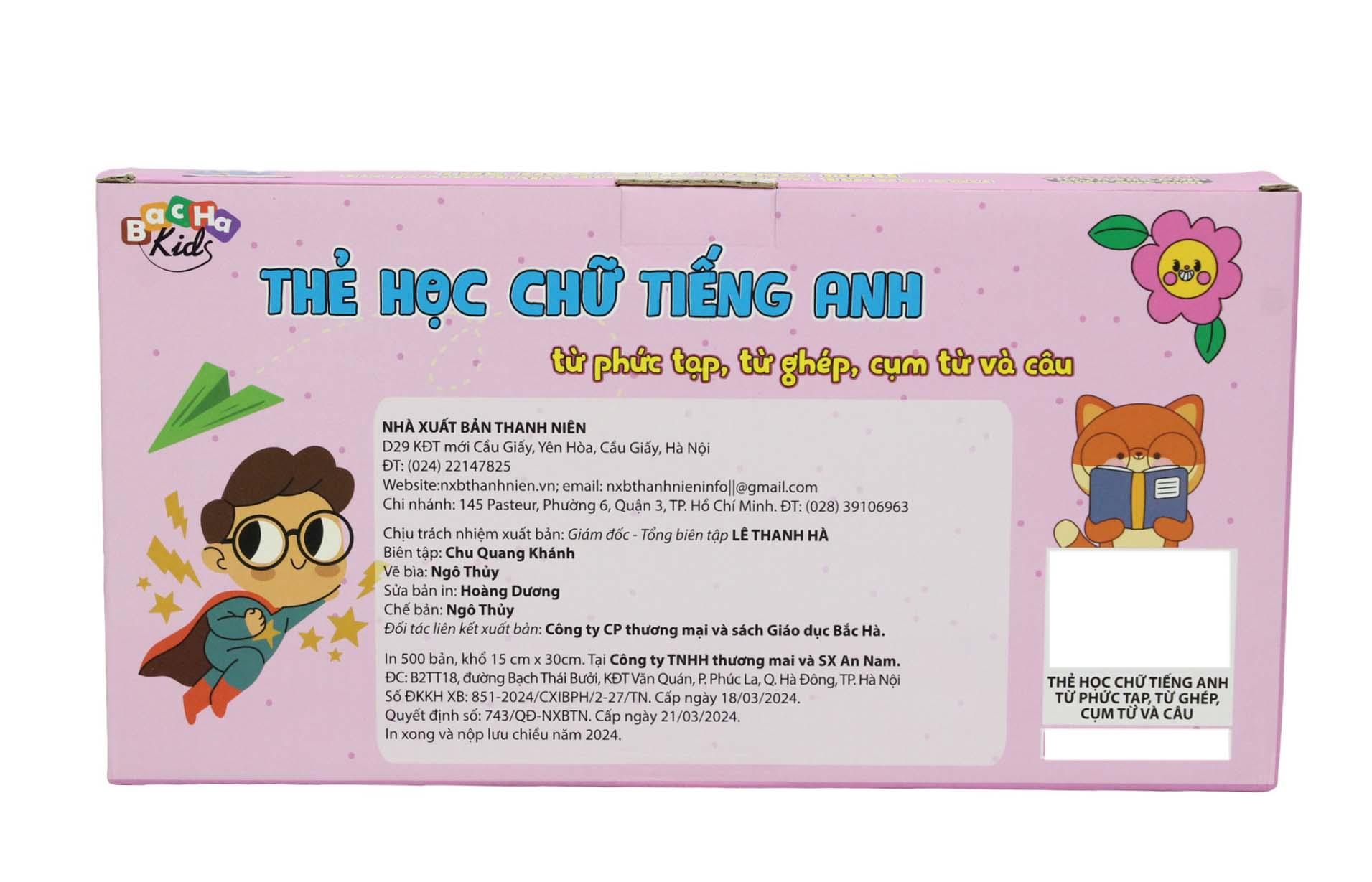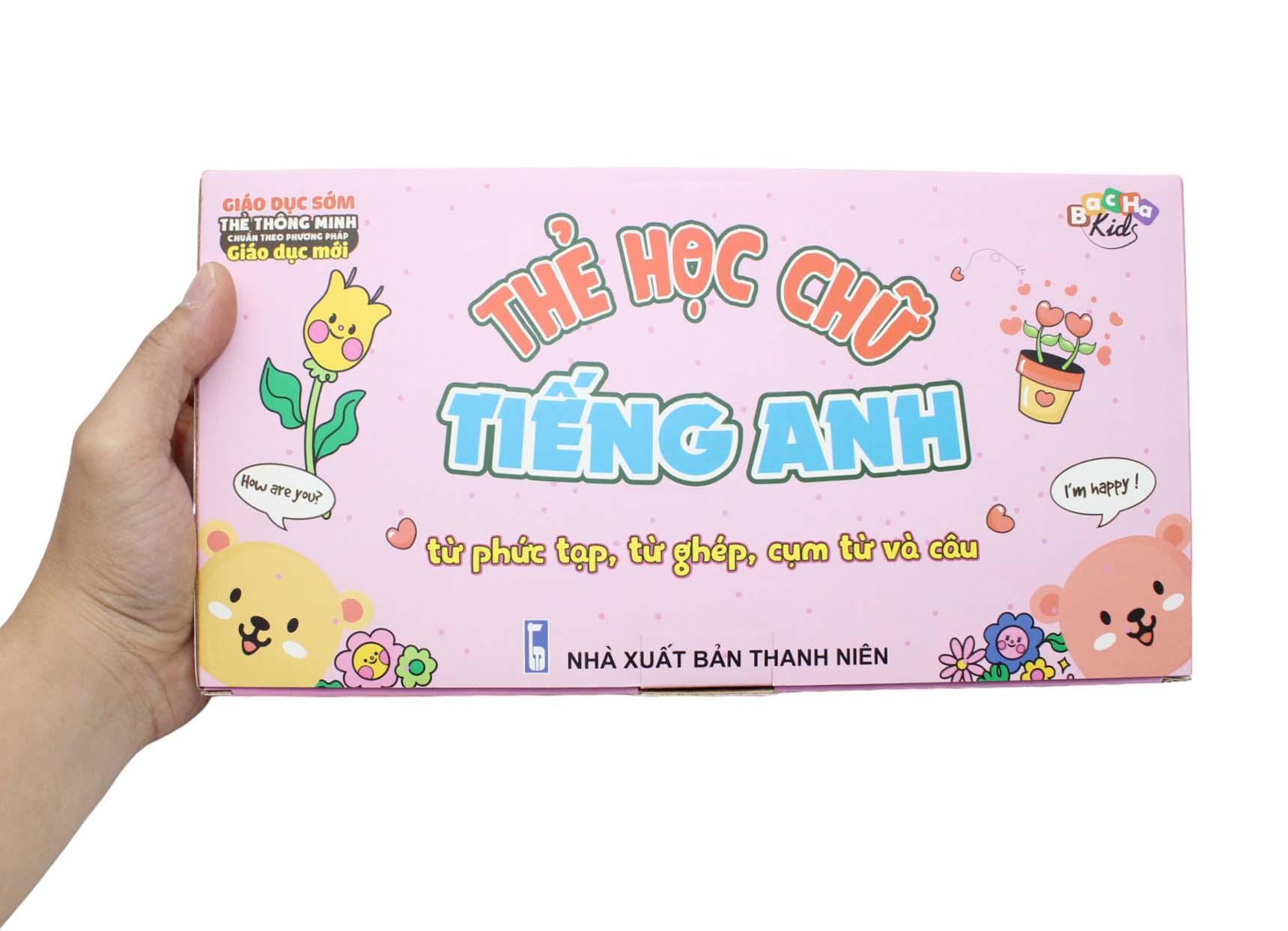 Flash Card Tiếng Anh - Từ Phức Tạp, Từ Ghép, Cụm Từ Và Câu Flashcard Dạy Trẻ Theo Phương Pháp Glenn Doman giúp bé tiếp cận tiếng Anh từ nhỏ, nhận biết và ghi nhớ những từ ngữ từ đơn giản đến phức tạp theo phương pháp Glenn Doman. Bộ thẻ là tập hợp những từ phức tạp, từ ghép, cụm từ và câu trong tiếng Anh với các chủ đề: Số đếm, thời gian, đồ vật, thành phần ngôi nhà... Flashcard được in trên chất liệu giấy ivory dày dặn, có độ cứng phù hợp cho tráo thẻ. Bộ gồm 102 thẻ chữ in 2 mặt (mặt trước màu xanh, mặt sau màu đen) và hướng dẫn sử dụng. Toàn bộ được đựng trong hộp sang trọng và tiện cho việc cất trữ.