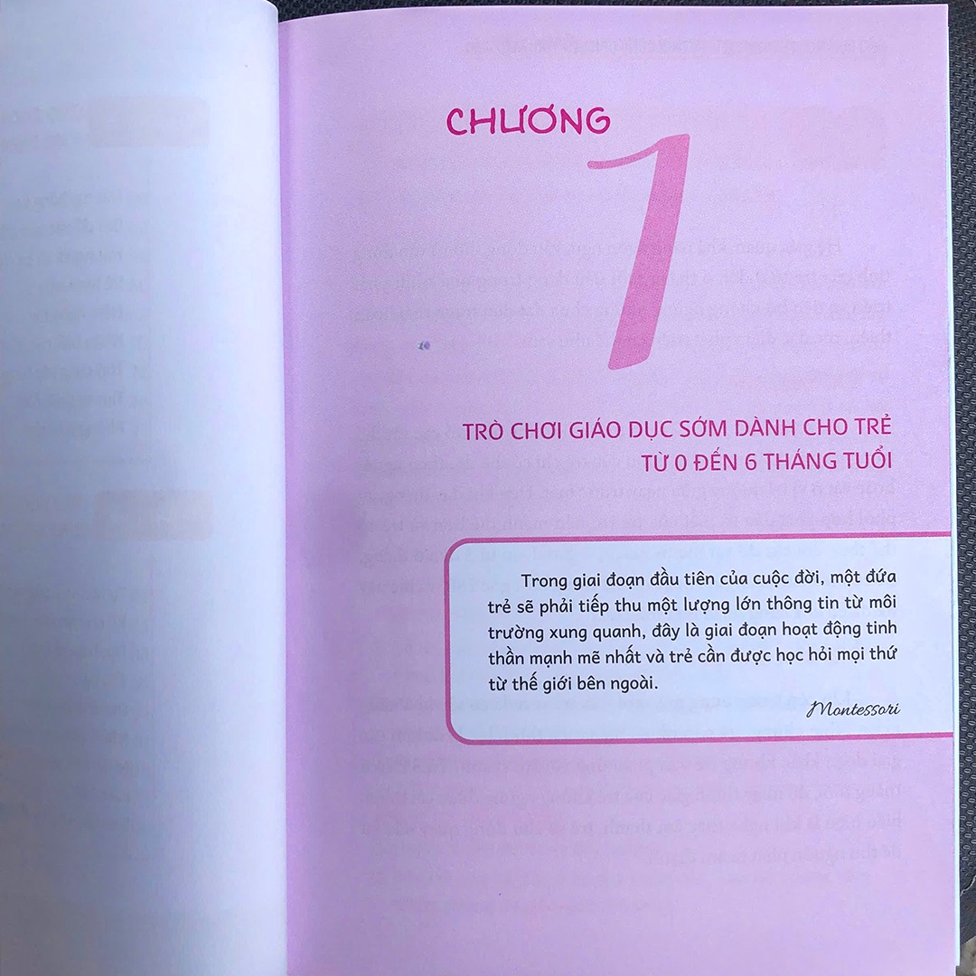 Sách: Giáo Dục Motessori Tại Nhà Maria Montessori từng nói:"Trẻ em sinh ra để học tập, phát triển cũng như cải thiện các hành vi, và chúng rất thích điều đó. Các nhà tâm lí học cho rằng trẻ em phải được vui chơi, bởi dưới sự trợ giúp của các trò chơi, sự phát triển của trẻ sẽ có xu hướng hoàn thiện hơn. Trẻ càng tâp trung cao độ thì càng kích thích đồng bộ giác gian, từ đó càng phát triển tư duy và hành động của mình." Giáo dục sớm theo phương pjasp Montessori bao gồm: