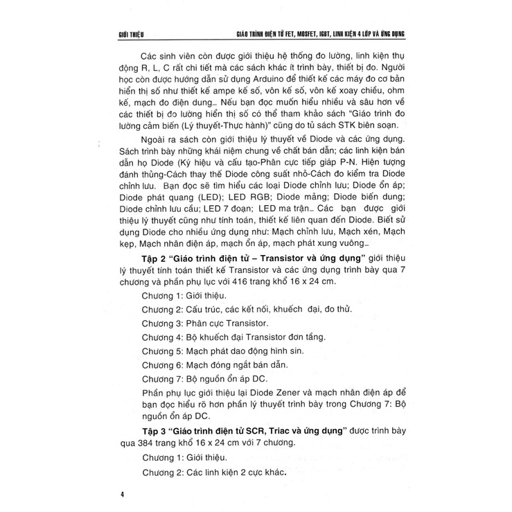 Giáo Trình Điện Tử FET - MOSFET - IGBT Linh Kiện 4 Lớp Và Ứng Dụng Điện tử là môn học cơ bản trong các Khoa Điện – Điện tử của nhiều trường. Cuốn “GIÁO TRÌNH ĐIỆN TỬ FET, MOSFET, IGBT, LINH KIỆN 4 LỚP VÀ ỨNG DỤNG" được biên soạn dựa trên cơ sở chương trình môn học Điện tử, dùng trong các trường Cao đẳng, Đại học khối công nghệ. Nó cung cấp cho sinh viên những kiến thức và kỹ năng cơ bản nhất của môn học và còn nhiều hơn thế nữa. Vì vậy, hiểu và thực hành theo những nội dung trong môn học này là việc không thể thiếu của các học sinh, sinh viên chuyên ngành Điện – Điện tử. Môn học Điện tử ngoài việc nghiên cứu bản chất vật lý, các quá trình diễn ra trong các linh kiện điện tử thụ động như R, L, C và các linh kiện tích cực như Diode, Fet, MosFET, IGBT, Thyristor, GTO, Triac, SID, MCT làm việc ở chế độ, khuếch đại, dao động, chuyển mạch trong quá trình biến đổi điện năng, khảo sát các tính năng kỹ thuật và những ứng dụng của các linh kiện này. Môn học còn tìm hiểu các bộ biến đổi qua việc liên kết các linh kiện điện tử và các thiết bị điện khác tạo thành một mạch điện cụ thể bao gồm mạch điều khiển, mạch động lực. Việc tìm hiểu Lý thuyết, tính toán và thực hành các linh kiện thụ động và tích cực đều có ý nghĩa quan trọng. Trong năm 2020-2023 tủ sách STK biên soạn bộ sách học Điện tử gồm những chuyên đề sau:
