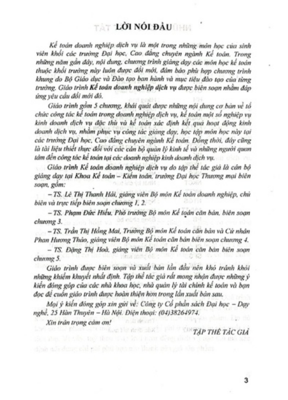 HH Giáo trình gồm 5 chương, khái quát được những nội dung cơ bản về tổ chức công tác kế toán trong doanh nghiệp dịch vụ, kế toán một số nghiệp vụ kinh doanh dịch vụ đặc thù và kế toán xác định kết quả hoạt động kinh doanh dịch vụ, nhằm phục vụ công tác giản giảng dạy, học tập môn học này tại các trường Đại học, Cao đẳng chuyên ngành Kế toán. Đồng thời, đây cũng là tài liệu thiết thực đối với các cán bộ quản lý kinh tế và nhẹ những người quan tâm đến công tác kế toán tại các doanh nghiệp kinh doanh dịch vụ. Đây ch
