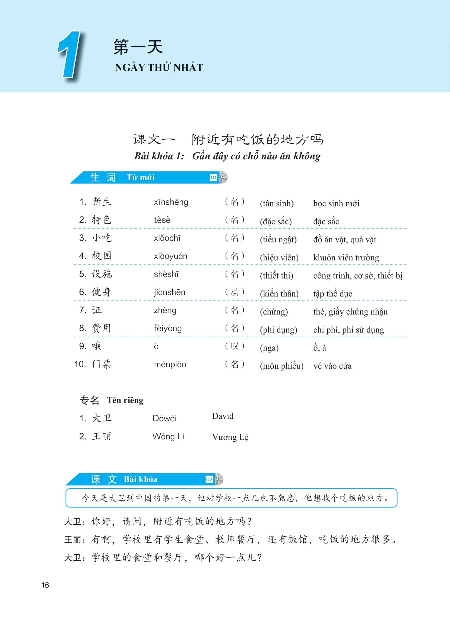 • Từ mới: Mỗi bài học sẽ bắt đầu bằng những từ mới gồm chữ Hán, phiên âm, nghĩa Hán Việt và nghĩa tiếng Việt. Qua đó, sách cung cấp cho bạn đủ về mặt chữ, cách phát âm và nghĩa của từ vựng.