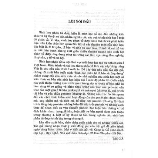 Sinh học phân tử là một lĩnh vực mới được học tập và nghiên cứu ở Việt Nam. Giáo trình và tài liệu tham khảo về lĩnh bằng tiếng Việt là yêu cầu cần thiết ở nước ta. Để đáp ứng nhu cầu của độc giả, chúng tôi xuất bản cuốn sách "Sinh học phân tử tế bào và ứng dụng" nhằm cung cấp cho sinh viên và các nhà nghiên cứu sinh học một số phimnh vực này kiến thức cơ bản của sinh học hiện đại ở mức độ phân tử. Cuốn sách này giới thiệu những quá trình quan trọng xảy ra trong tế bào, nhờ đó m trong cấu trúc củ làm sáng tỏ sự giống và khác nhau trong trúc của một gen ở tế prokaryot và euk của gào, nhờ genome, cấu n ở tế bào pro và eukaryot (chương 1), quá trình tái bản và sửa chữa genome (chương 2). Những cấu trúc đó liên quan đến các cách thức kiểm soát hoạt động của các gen ở giai đoạn phiên mã, sau phiên mã và dịch mã để tổng hợp protein (chương 3). Quá trình tổng hợp protein, những biến đổi cấu trúc protein và những cách thức để nhận biết và vận chuyển protein đặc hiệu đến những vị trí đích khác nhau trong tế bào hoặc tiết ra bên ngoài được giới thiệu trong chương 4. Một số kỹ thuật cơ bản trong nghiên cứu sinh học phân tử được trình bày trong chương 5. sammylog MGA SS