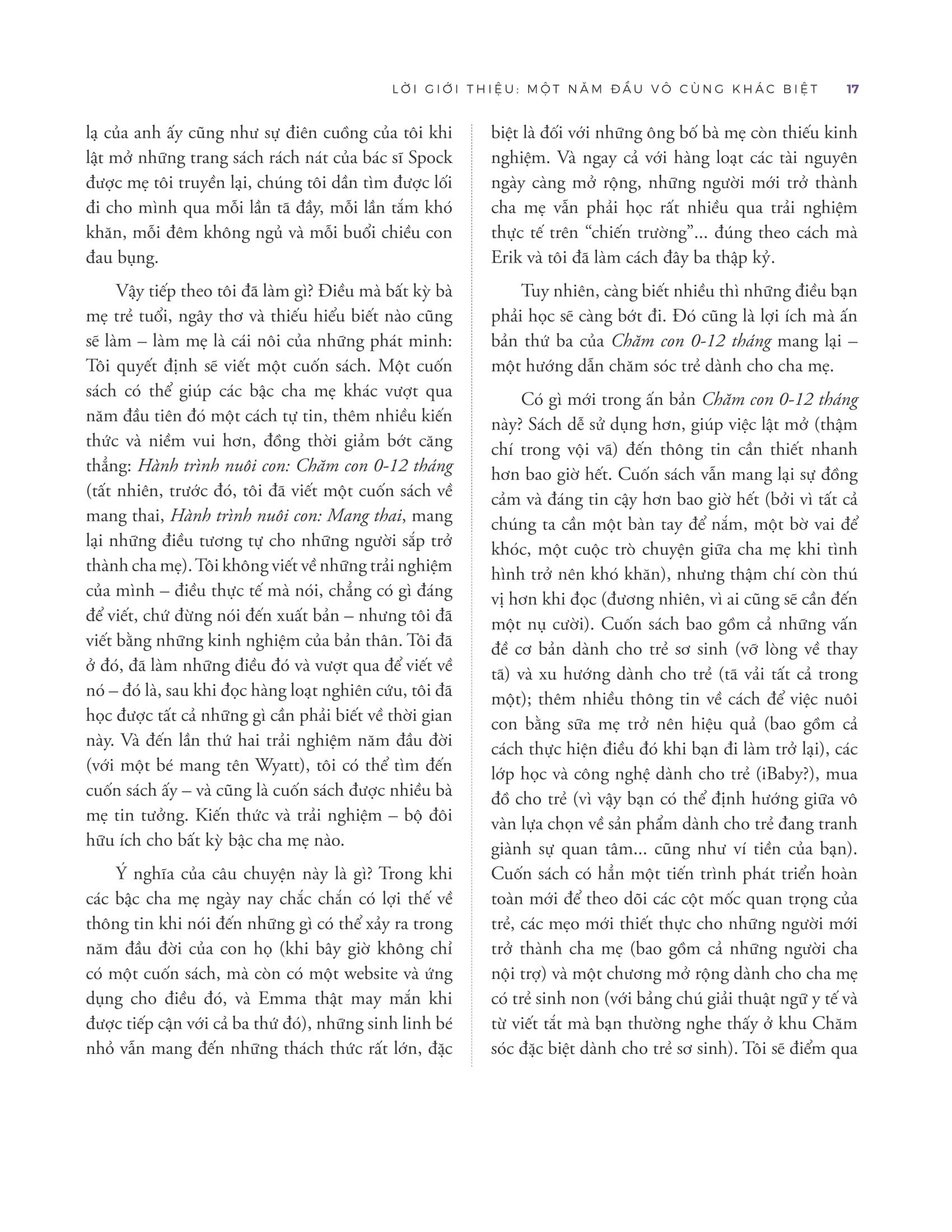 Đặc biệt, cuốn sách không chỉ dừng lại ở việc chăm sóc thể chất mà còn chú trọng đến việc phát triển tinh thần của trẻ. Tác giả đưa ra cho các bậc cha mẹ những lời khuyên về việc tạo dựng mối liên kết giữa cha mẹ và con cái, cách giải quyết các vấn đề hành vi và giúp trẻ phát triển kỹ năng xã hội. Đồng thời, cuốn sách cũng chia sẻ những kinh nghiệm thực tế từ các bậc cha mẹ khác, giúp độc giả thấy m.ình không đơn độc trong hành trình nuôi con. Các trường hợp cụ thể và cách xử lý tình huống thực tế được đề cập trong sách sẽ là nguồn động viên và hỗ trợ tinh thần lớn lao cho các bậc cha mẹ.