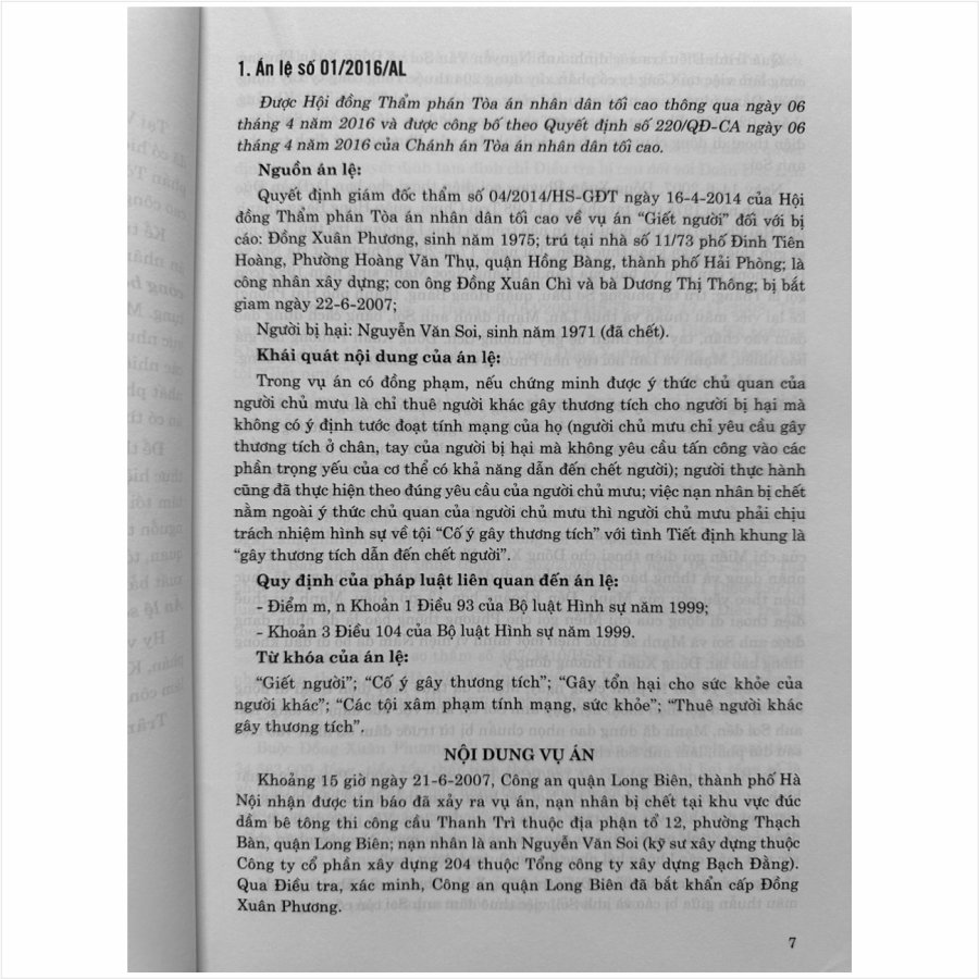 - Toàn bộ sách bìa mềm khổ lớn 19 x 27 cm phân phối bởi Nhà sách Nam Việt đều được bọc sách Plastic MIỄN PHÍ và xuất hóa đơn điện tử đầy đủ, nhanh chóng. …//… Lời giới thiệu: Án lệ là kết quả của quá trình nghiên cứu, xây dựng pháp luật, tạo thêm hành lang pháp lý cho Thẩm phán xem xét và áp dụng trong xét xử. Án lệ được công bố và áp dụng tại Việt Nam sẽ góp phần giải quyết những khó khăn, vướng mắc trong công tác xét xử, bảo đảm áp dụng thống nhất pháp luật, công bằng, minh bạch để chất lượng xét xử ngày được nâng cao. Tại Nghị quyết số 04/2019/NQ-HĐTP ngày 18 tháng 6 năm 2019 của Hội đồng Thẩm phán tối cao thì án lệ được hiểu là những lập luận, phán quyết trong bản án, quyết định đã có hiệu lực pháp luật của tòa án về một vụ việc cụ thể được Hội đồng Thẩm phán Tòa án nhân dân tối cao lựa chọn và được Chánh án Tòa án nhân dân tối cao công bố là án lệ để các tòa án nghiên cứu, áp dụng trong xét xử. Kể từ năm 2016 đến nay, Hội đồng Thẩm phán Tòa án nhân dân tối cao đã thông qua và Chánh án Tòa án nhân dân tối cao đã công bố 70 án lệ thuộc các lĩnh vực dân sự, hình sự, hành chính, đất đai và tố tụng. Án lệ không chỉ đơn thuần là quyết định của tòa án, mà còn đại diện cho sự đánh giá và phân tích kỹ lưỡng của Hội đồng Thẩm phán Tòa án nhân dân tối cao. Các lập luận trong án lệ phản ánh sự thẩm định chính xác về quyền và nghĩa vụ pháp lý, áp dụng các quy tắc và nguyên tắc pháp luật đối với vụ việc cụ thể. Qua việc công bố án lệ, Tòa án nhân dân tối cao mong muốn chia sẻ những quan điểm pháp lý, nguyên tắc và quy tắc áp dụng trong quyết định của mình với các tòa án khác. Điều này giúp tạo ra sự nhất quán trong việc hiểu và áp dụng pháp luật, đồng thời góp phần tăng cường sự công bằng và tin cậy của hệ thống tư pháp …//… Nhằm phổ biến đến Quý Cơ quan, Đơn vị và Quý khách hàng thân thiết nắm bắt kịp thời những Án lệ đã ban hành. Nhà sách Nam Việt xin trân trọng giới thiệu cuốn sách: Hệ Thống Án Lệ Việt Nam – Từ Án Lệ số 01 đến Án Lệ số 72 72 Án Lệ Việt Nam gồm: – Án lệ 01/2016/AL về vụ án giết người – Án lệ 02/2016/AL về vụ án tranh chấp đòi lại tài sản – Án lệ 03/2016/AL về vụ án ly hôn – Án lệ 04/2016/AL về tranh chấp hợp đồng chuyển nhượng quyền sử dụng đất – Án lệ 05/2016/AL về vụ án tranh chấp di sản thừa kế – Án lệ 06/2016/AL về vụ án tranh chấp thừa kế – Án lệ 07/2016/AL về vụ án dân sự tranh chấp quyền sở hữu, sử dụng nhà – Án lệ 08/2016/AL về xác định lãi suất, việc điều chỉnh lãi suất trong hợp đồng tín dụng kể từ ngày tiếp theo của ngày xét xử sơ thẩm – Án lệ 09/2016/AL về xác định lãi suất nợ quá hạn trung bình trên thị trường và việc trả lãi trên số tiền phạt vi phạm, bồi thường thiệt hại – Án lệ 10/2016/AL về quyết định hành chính là đối tượng khởi kiện vụ án hành chính – Án lệ 60/2023/AL về thời hạn trả thưởng xổ số kiến thiết – Án lệ 61/2023/AL về chấm dứt việc nuôi con nuôi khi con nuôi chưa thành niên – Án lệ 62/2023/AL về thời điểm bắt đầu thực hiện nghĩa vụ cấp dưỡng cho con chưa thành niên trong vụ án tranh chấp về xác định cha cho con – Án lệ 63/2023/AL về xem xét quyết định hành chính có liên quan đến hành vi hành chính bị khiếu kiện – Án lệ số 64/2023/AL về định khung hình phạt và tình tiết định khung tăng nặng “có tổ chức” trong tội “Bắt cóc nhằm chiếm đoạt tài khoản”; – Án lệ số 65/2023/AL về truy cứu trách nhiệm hình sự tội “Mua bán người”; – Án lệ số 66/2023/AL về việc xác định tội danh “Mua bán người”; – Án lệ số 67/2023/AL về người được nhận hiện vật khi chia tài sản chung; – Án lệ số 68/2023/AL về quyền nhận di sản bằng hiện vật là nhà ở của người thừa kế là người Việt Nam định cư ở nước ngoài; – Án lệ số 69/2023/AL về thẩm quyền của Trọng tài thương mại trong việc giải quyết tranh chấp thỏa thuận bảo mật thông tin và không cạnh tranh; – Án lệ số 70/2023/AL về việc chấm dứt hợp đồng lao động đối với người lao động là cán bộ công đoàn không chuyên trách – Án lệ số 71/2023/AL về việc đình chỉ giải quyết vụ án với lý do sự việc đã được giải quyết bằng quyết định có hiệu lực của cơ quan nhà nước có thẩm quyền và không thuộc thẩm quyền giải quyết của tòa án – Án lệ số 72/2023/AL về xác định di sản thừa kế là quyền sử dụng đất trong trường hợp di chúc không thể hiện diện tích đất cụ thể Cảm ơn các bạn đã ghé thăm shop Nhà sách Nam Việt ! Sách Hệ Thống Án Lệ Việt Nam – Từ Án Lệ số 01 đến Án Lệ số 72 - ThS Quách Dương Sách Hệ Thống Án Lệ Việt Nam – Từ Án Lệ số 01 đến Án Lệ số 72 - ThS Quách Dương