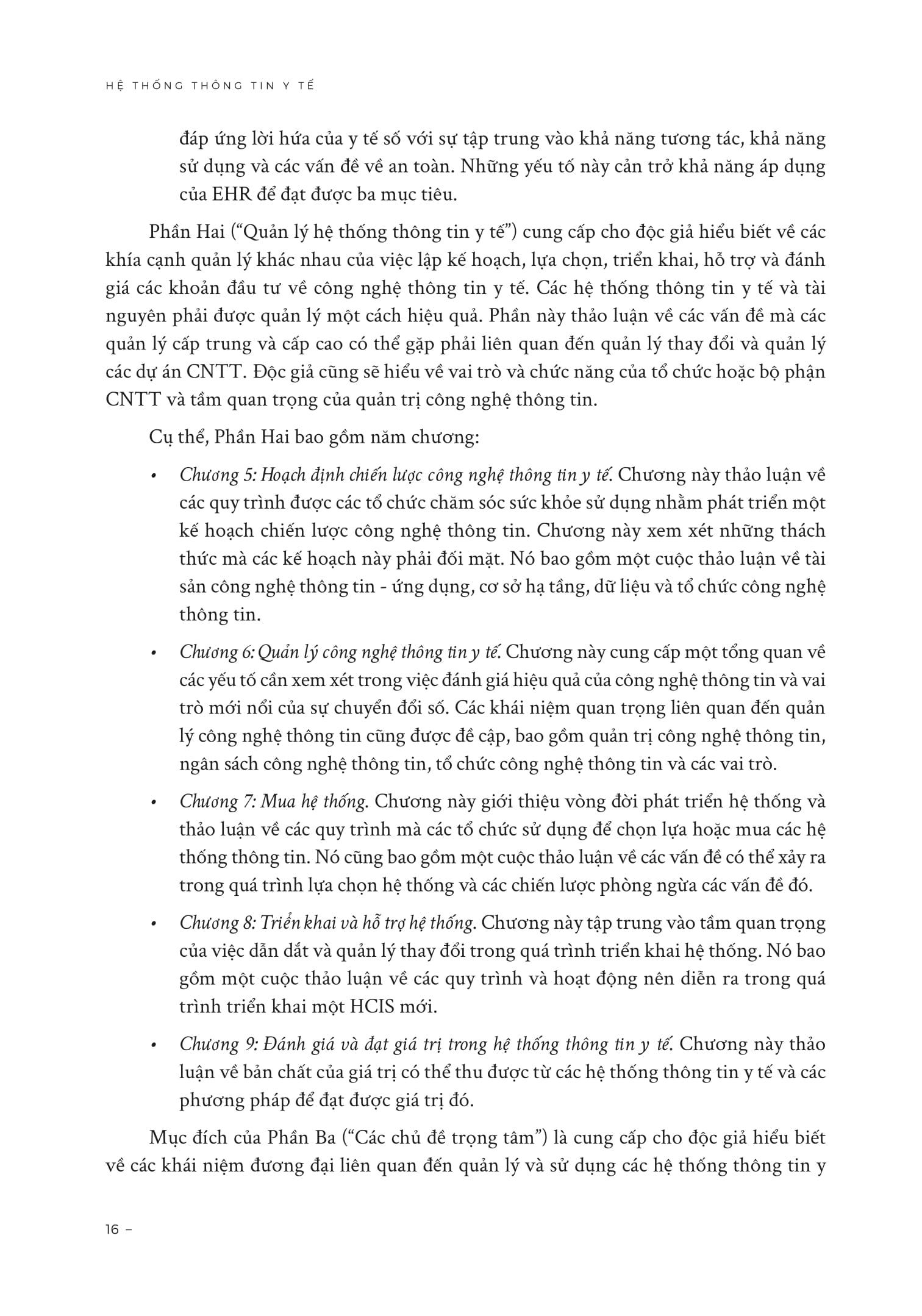 • Các nghiên cứu điển hình đầy đủ và các tài nguyên bổ sung, chẳng hạn như hồ sơ dự án mẫu và tổng quan về ngành công nghệ thông tin chăm sóc sức khỏe Cuốn sách này là một tài liệu tham khảo không thể thiếu, một bản hướng dẫn toàn diện và trực quan về quản lý thông tin và công nghệ thông tin trong chăm sóc sức khỏe, góp phần hỗ trợ các đơn vị y tế phát triển hệ thống thông tin y tế hiện đại, hiệu quả, bền vững.