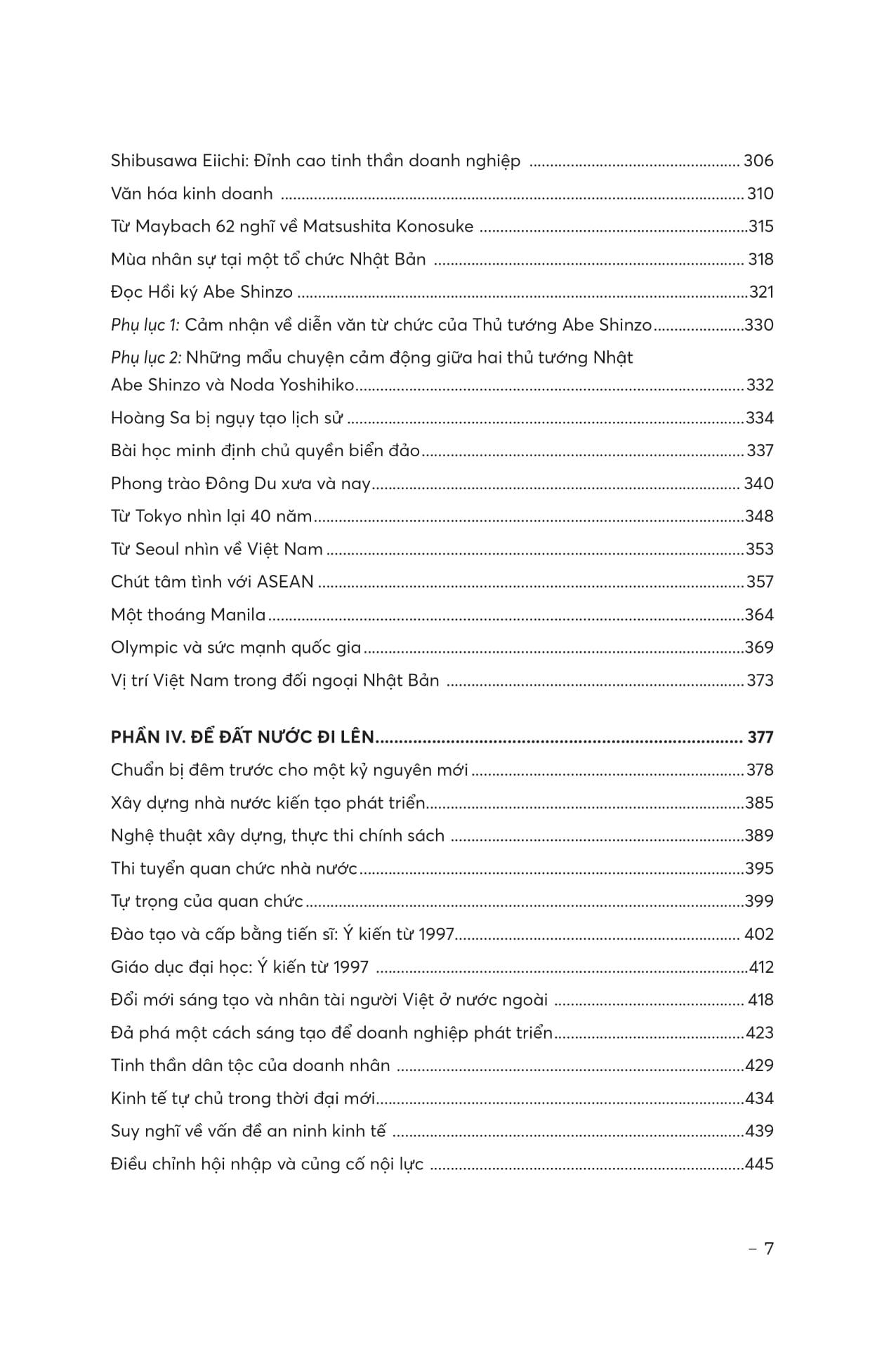 Phần III và IV: Tập trung vào các vấn đề thời sự như kinh tế thị trường, giáo dục đại học, chính sách công, lãnh đạo quốc gia, văn hóa chính trị, kinh nghiệm quốc tế và khát vọng phát triển đất nước.