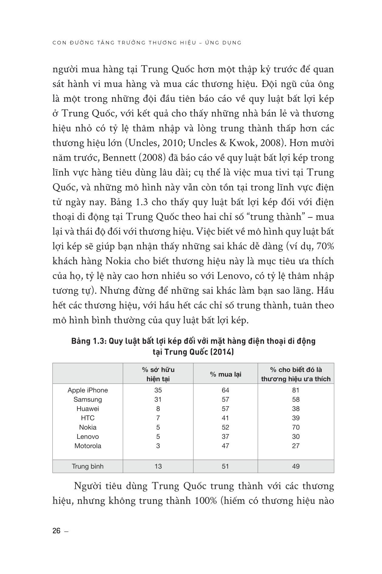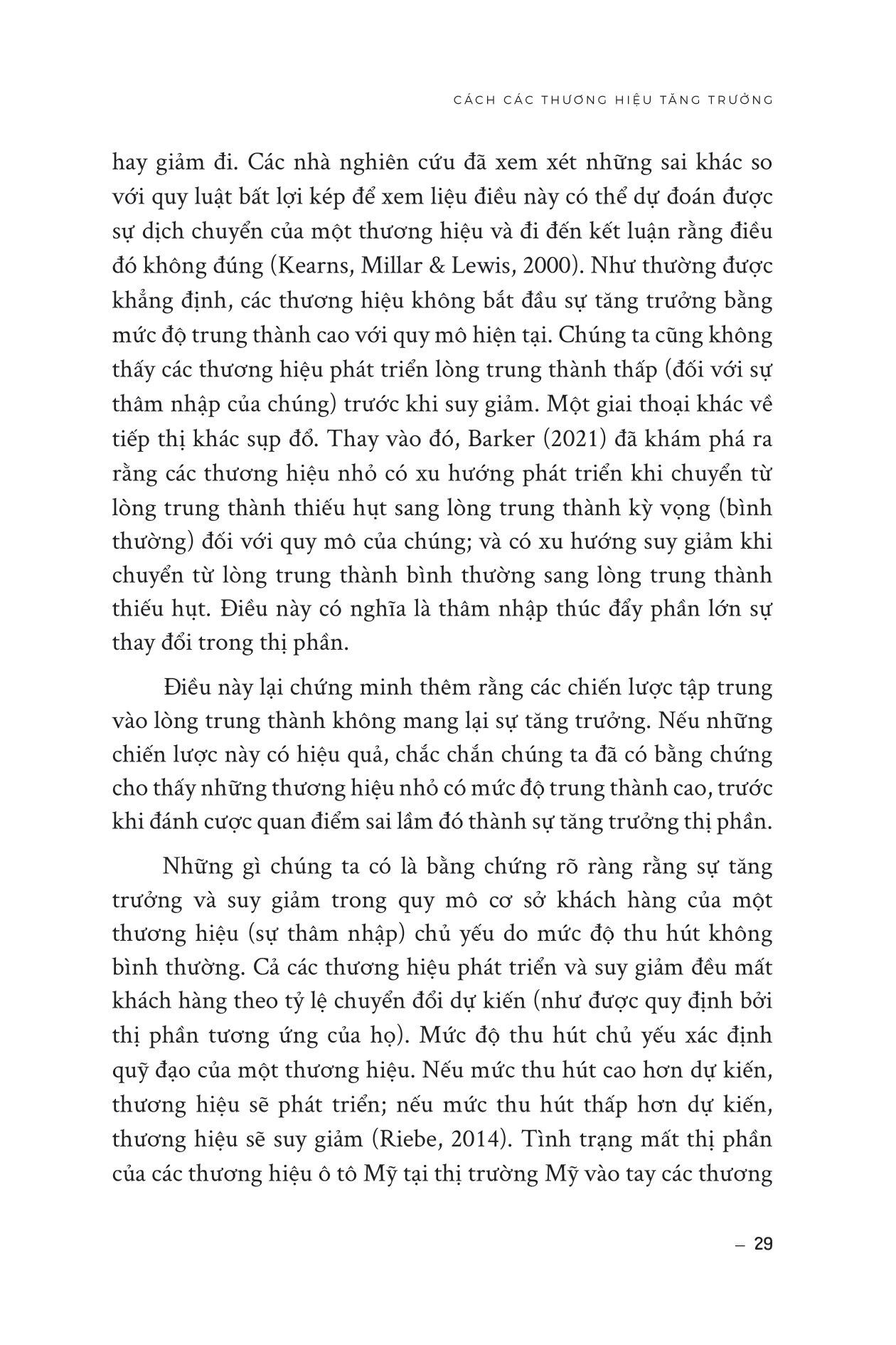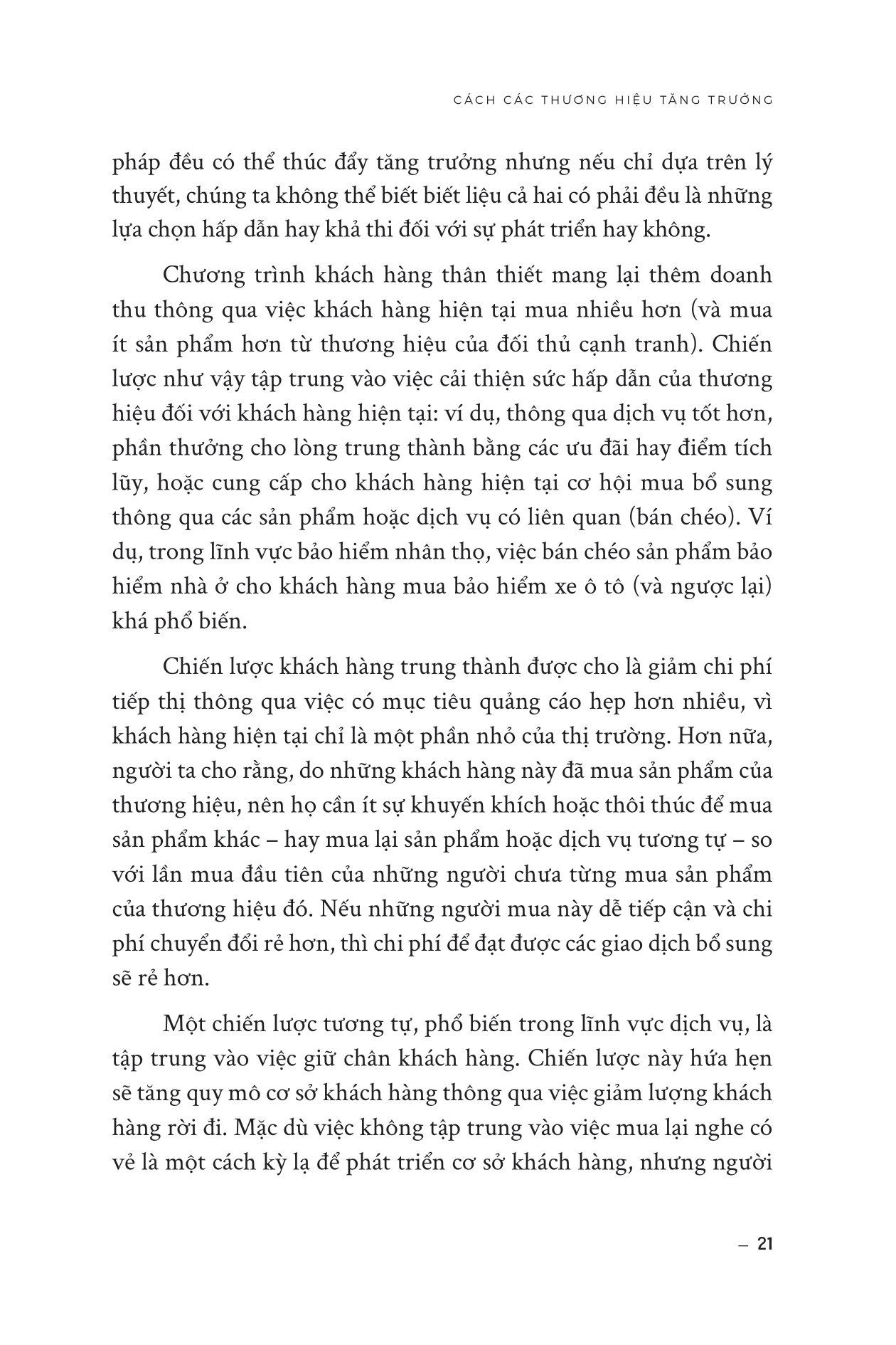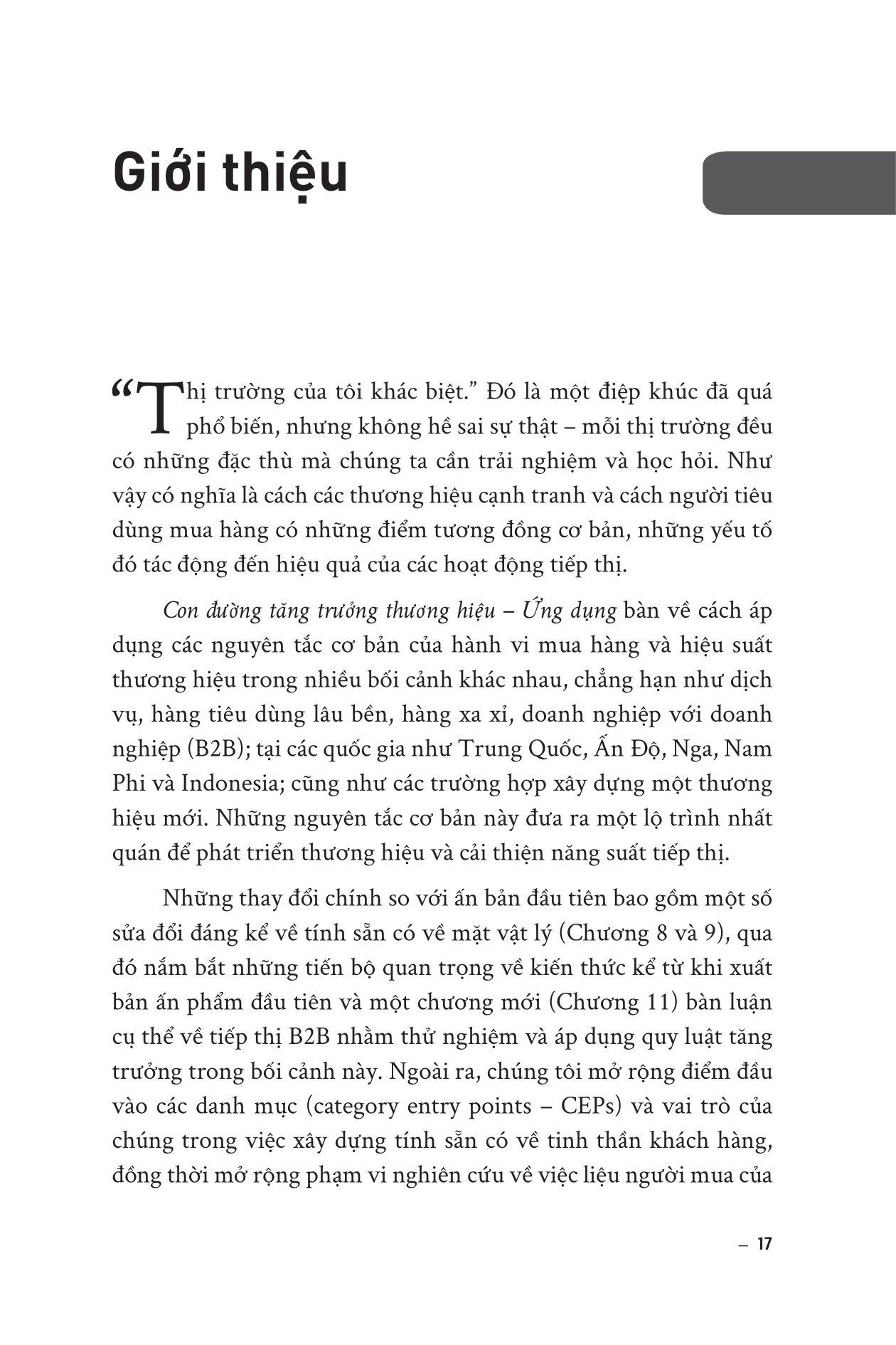 - Tập trung vào các hoạt động marketing định kỳ, như quảng cáo liên tục và khuyến mãi, để giữ chân khách hàng hiện có. Cuốn sách này có gì đặc biệt? Đầu tiên, cuốn sách giúp độc giả hiểu rõ hơn về cách các khách hàng thực sự mua hàng và tương tác với thương hiệu. Các nhà quản lý sẽ học được cách phát hiện ra các yếu tố quan trọng trong quá trình mua hàng và cách thiết lập mối quan hệ với khách hàng của m.ình. Thứ hai, cuốn sách chỉ ra các công cụ và phương pháp nghiên cứu giúp độc giả hiểu rõ hơn về thị trường và khách hàng của họ, đồng thời đánh giá các yếu tố ảnh hưởng đến quyết định mua hàng của khách hàng cũng như cách tạo ra trải nghiệm khách hàng tốt nhất để tăng trưởng doanh số bán hàng. Cuối cùng, cuốn sách mang lại cho độc giả một cái nhìn toàn diện về tăng trưởng thương hiệu và doanh số bán hàng không chỉ trong các thị trường phát triển mà còn ở các thị trường mới nổi, dịch vụ, hàng tiêu dùng, B2B và thương hiệu sang trọng. Các độc giả sẽ học được cách phát triển chiến lược marketing hiệu quả và tăng trưởng doanh số bán hàng trong nhiều loại hình thị trường khác nhau. Cuốn sách này dành cho ai? Cuốn sách hướng tới độc giả là các nhà quản lý thương hiệu, các chuyên gia marketing, các nhà nghiên cứu cũng như những người cần giải quyết các công việc liên quan đến tăng trưởng thương hiệu và phát triển chiến lược marketing hiệu quả. Các độc giả mong muốn có thêm các kiến thức và phương pháp để phát triển chiến lược marketing và tăng trưởng doanh số bán hàng. Cuốn sách giúp các độc giả hiểu rõ hơn về các yếu tố quan trọng để thu hút khách hàng mới và giữ chân khách hàng hiện có, cũng như đưa ra các khuyến nghị cụ thể về cách tăng trưởng thương hiệu trong các thị trường mới nổi, dịch vụ, hàng tiêu dùng, B2B và thương hiệu xa xỉ. Giới thiệu về tác giả Giáo sư Byron Sharp là Giám đốc Viện Khoa học Tiếp thị Ehrenberg-Bass tại Đại học Nam Úc. Nghiên cứu cơ bản của Viện được sử dụng và hỗ trợ tài chính bởi nhiều tập đoàn hàng đầu thế giới bao gồm Coca-Cola, Kraft, Kellogg's, British Airways, Procter & Gamble, Nielsen, TNS, Turner Broadcasting, Network Ten, Simplot, Mars và nhiều tập đoàn khác. Tiến sĩ Sharp đã xuất bản hơn 100 bài báo học thuật và là thành viên ban biên tập của năm tạp chí. Gần đây, ông đồng tổ chức một hội nghị tại Trường Kinh doanh Wharton về luật quảng cáo và cùng với Giáo sư Jerry Wind, đang biên tập một số đặc biệt của Tạp chí Nghiên cứu Quảng cáo về chủ đề này. Giáo sư Jenni Romaniuk là Phó Giám đốc (Quốc tế) của Viện Ehrenberg-Bass, Đại học Nam Úc. Trước đây, Jenni là biên tập viên điều hành của Tạp chí Nghiên cứu Quảng cáo, và hiện là thành viên Ban Cố vấn Cấp cao của Tạp chí. Đánh giá về cuốn sách “Nếu đã đọc và yêu thích Con đường tăng trưởng thương hiệu phần 2, đã đến lúc bạn cần chuyển sang cấp độ tiếp thị cao hơn. Và nếu chưa đọc, hãy chuẩn bị sẵn sàng -- cuốn sách này sẽ thay đổi cách bạn tư duy về tiếp thị mãi mãi.” - Goodreads “Đây là cuốn sách không thể bỏ qua đối với bất kỳ ai đang làm việc trong lĩnh vực Tiếp thị và Xây dựng Thương hiệu. Nếu bạn dày dạn kinh nghiệm, hãy từ những gì bạn NGHĨ bạn biết và đọc cuốn sách này.” - Henry Manampiring, tác giả
