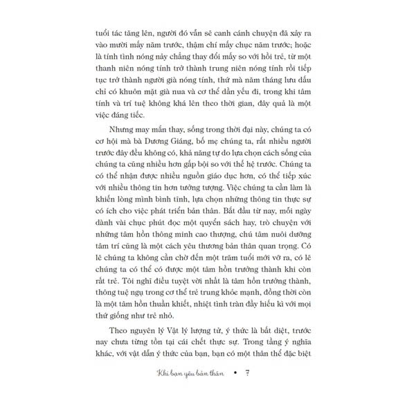 Lúc bạn thực sự bắt đầu hiểu được làm thế nào để yêu bản thân vô điều kiện và khiến bản thân hạnh phúc, tình yêu của bạn sẽ truyền tới những người bên cạnh một cách tự nhiên, tình yêu này mới là tình yêu thuần khiết, không mang tính kiểm soát và không vụ lợi.