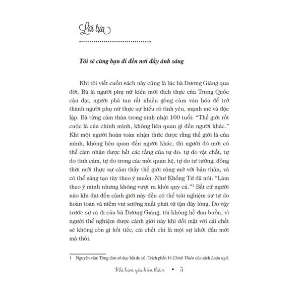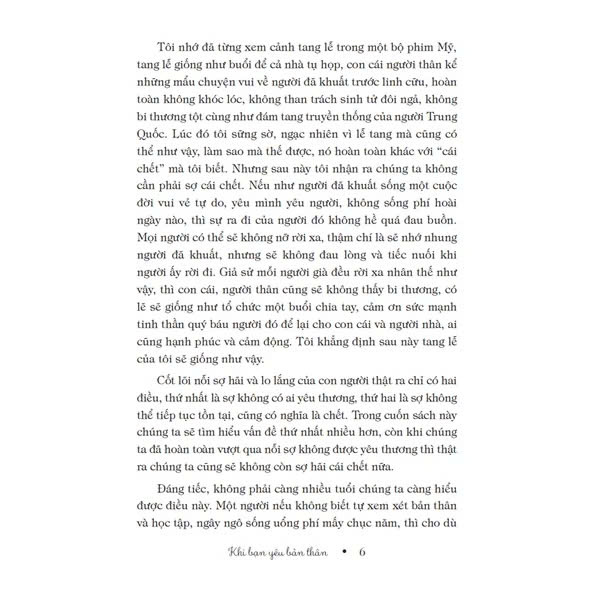 Khi chúng ta nói đến “yêu bản thân”, nhiều người sẽ cho rằng đó là ích kỉ. Thậm chí có nhiều người vẫn coi “cả đời sống vì người khác” là phẩm chất tốt đẹp đáng được ca tụng. Nhưng họ không biết rằng một người không biết cách yêu bản thân sẽ không biết cách yêu người khác, khi chính họ còn chưa trải nghiệm yêu bản thân là như thế nào thì thứ cho đi cùng lắm chỉ là thứ mô phỏng tình yêu, có thể là lấy lòng, trao đổi, bồi thường, dựa dẫm, say mê, nhu cầu… Nhưng chúng đều không phải là tình yêu đích thực.