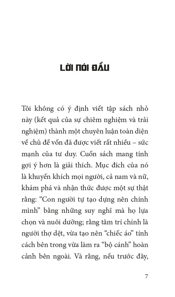 Cuốn sách khai mở cách mà tư duy định hình tính cách, hành vi, hoàn cảnh – và cuối cùng là số phận. Bằng việc làm chủ tâm trí, bạn nắm trong tay chiếc chìa khóa để: