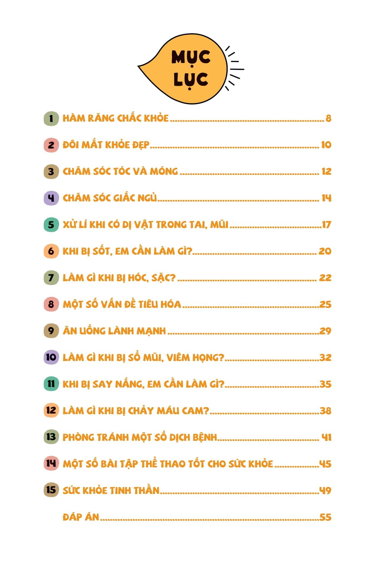 trong suốt 15 bài học kỹ năng sống, các em sẽ được tìm hiểu về cách bảo vệ từng bộ phận trên cơ thể, như răng, mắt, tóc, giấc ngủ... cho đến cách ứng xử an toàn khi gặp các vấn đề thường gặp như sốt, hóc, sặc, sổ mũi hay chảy máu cam. thông qua các tình huống minh họa sinh động, các em sẽ học được cách yêu thương chính m.ình thông qua việc ăn uống lành mạnh, giữ vệ sinh, biết cách lắng nghe cơ thể và xử lý linh hoạt khi gặp sự cố. đặc biệt, cuốn sách còn mở rộng nội dung quan tâm đến sức khỏe tinh thần, một yếu tố ngày càng quan trọng trong sự phát triển toàn diện của các em học sinh trong xã hội hiện đại.