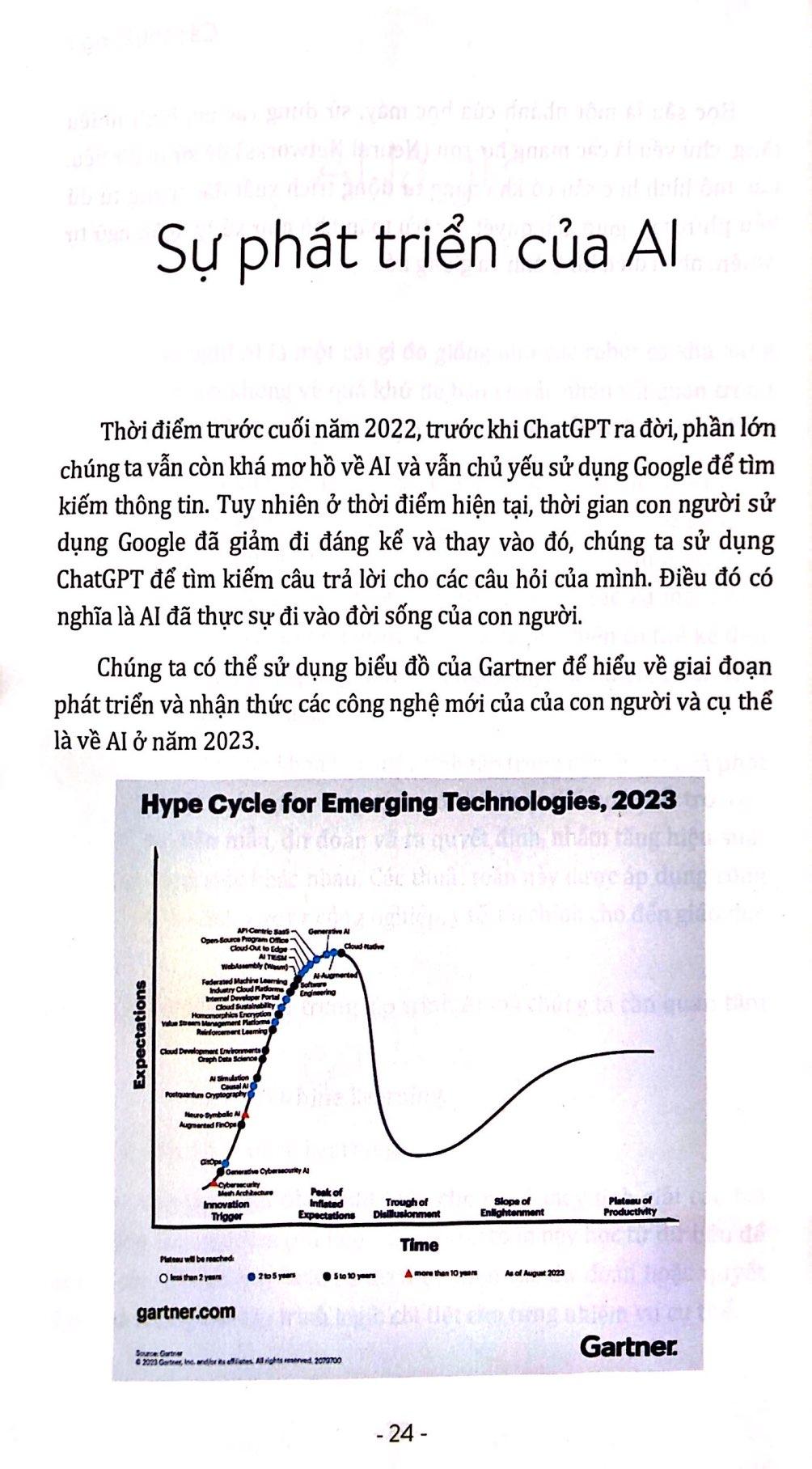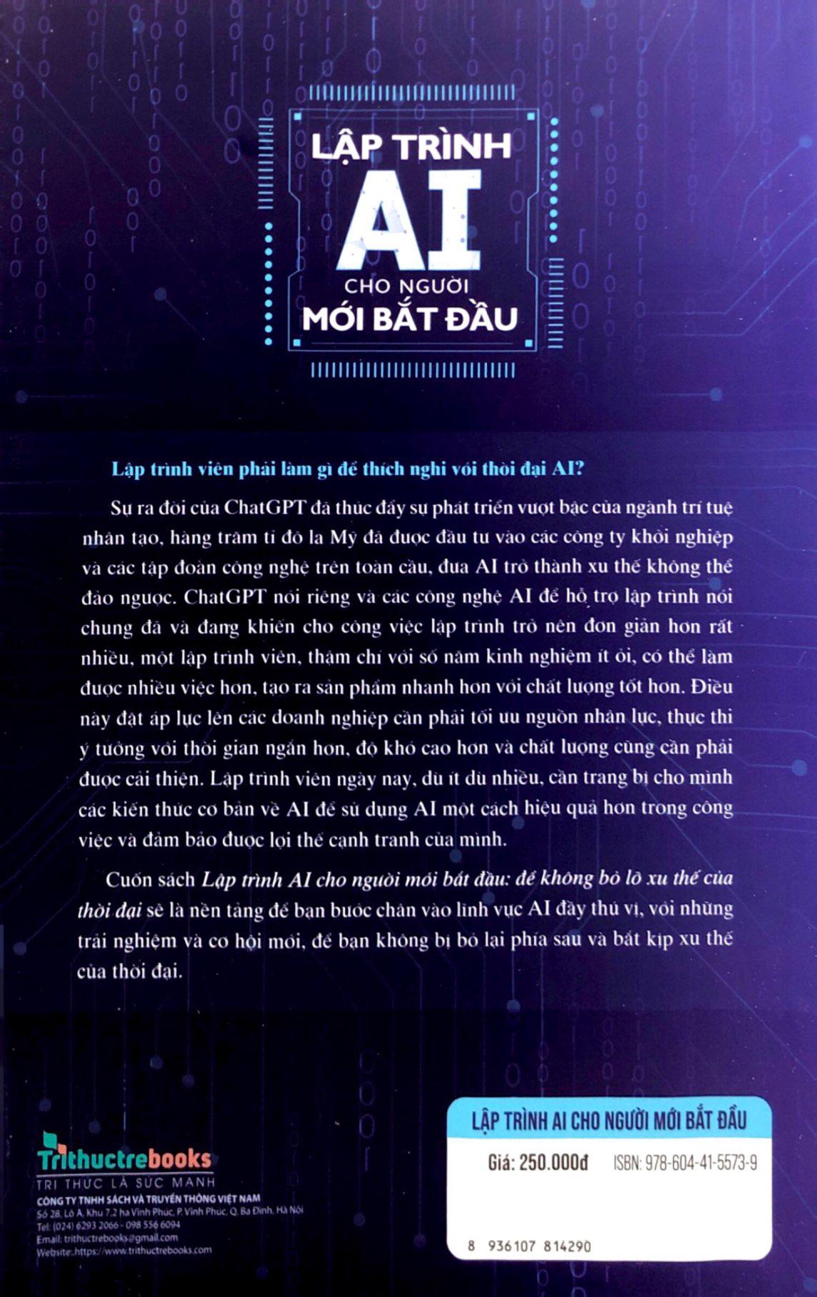 Lập Trình AI Cho Người Mới Bắt Đầu - Để Không Bỏ Lỡ Xu Thế Của Thời Đại GIỚI THIỆU VỀ CUỐN SÁCH Trí tuệ nhân tạo (Artificial Intelligence - AI) đang làm thay đổi thế giới với tốc độ chóng mặt. Từ những trợ lý ảo thông minh đến các thuật toán dự đoán phức tạp, AI đã len lỏi vào mọi ngóc ngách cuộc sống. Để bắt kịp xu hướng và tận dụng tối đa tiềm năng của AI, việc trang bị cho bản thân những kiến thức cơ bản về lập trình AI đã trở nên quan trọng hơn bao giờ hết. Cuốn sách Lập trình AI cho người mới bắt đầu ra đời nhằm đáp ứng nhu cầu đó. Cuốn sách sẽ giúp các lập trình viên từ mọi trình độ nhanh chóng nắm vững những kiến thức cốt lõi để có thể tự tin khám phá và ứng dụng AI vào công việc của m.ình. Cuốn sách được thiết kế dành riêng cho lập trình viên mới tiếp xúc với AI. Với cách tiếp cận đơn giản, cuốn sách không chỉ cung cấp nền tảng kiến thức vững chắc về trí tuệ nhân tạo mà còn hướng dẫn bạn từng bước xây dựng các mô hình AI thực tế. Nhờ những ví dụ sinh động và bài tập thực hành phong phú, các lập trình viên sẽ nhanh chóng nắm vững các khái niệm cốt lõi và tự tin áp dụng AI vào các dự án của m.ình. Sách gồm 5 chương với các nội dung chính sau: Chương 1: Giới thiệu về AI Chương này sẽ cung cấp cái nhìn tổng quan về trí tuệ nhân tạo (AI), bắt đầu với định nghĩa cơ bản, lịch sử phát triển của nó, và những ứng dụng thực tế mà AI mang lại trong các lĩnh vực như y tế, tài chính, giao thông. Bên cạnh đó, chúng ta cũng sẽ tìm hiểu các công cụ quan trọng để làm việc với AI, như ngôn ngữ lập trình Python và các thư viện phổ biến hỗ trợ việc xây dựng mô hình AI. Chương 2: Bài toán trí tuệ nhân tạo Trong chương này, bạn sẽ được làm quen với các phương pháp giải quyết bài toán AI. Đầu tiên, chúng ta sẽ tìm hiểu về học máy truyền thống, với các thuật toán như SVM và Cây quyết định (Decision Trees). Sau đó, chúng ta sẽ khám phá các mô hình phức tạp hơn như Mạng nơ-ron, CNN, RNN, đồng thời sử dụng công cụ PyTorch để thực hành. Cuối cùng, chúng ta sẽ áp dụng các kiến thức này để giải quyết một bài toán thực tế. Chương 3: Ứng dụng vào thực tế Chương này sẽ giúp bạn hiểu rõ quy trình xây dựng một hệ thống AI từ đầu đến cuối. Bạn sẽ học cách thiết kế, cài đặt, và triển khai mô hình AI trong thực tế. Đây là phần quan trọng, giúp bạn nắm bắt cách thức áp dụng lý thuyết vào các dự án thực tế và phát triển các ứng dụng AI. Chương 4: ChatGPT Chương này sẽ giới thiệu về ChatGPT, một trong những ứng dụng phổ biến của AI trong lĩnh vực xử lý ngôn ngữ tự nhiên. Bạn sẽ hiểu cơ chế hoạt động của ChatGPT và cách nó có thể được ứng dụng. Hơn nữa, bạn sẽ học cách phát triển các ứng dụng sử dụng ChatGPT để giải quyết các vấn đề thực tiễn. Chương 5: Định hướng nghề nghiệp Cuối cùng, chương này sẽ giúp bạn định hướng nghề nghiệp trong lĩnh vực AI, giới thiệu các vai trò khác nhau trong ngành và kỹ năng cần thiết để thành công. Bạn sẽ tìm hiểu về thị trường việc làm hiện tại, cơ hội phát triển nghề nghiệp, cũng như các bước phát triển bản thân để tiến xa trong ngành AI. Lập trình AI cho người mới bắt đầu sẽ là một cuốn sách hữu ích, giúp bạn nắm vững kiến thức về AI trong lập trình, hỗ trợ bạn tự động hóa nhiều công việc lặp đi lặp lại, giải phóng thời gian để bạn tập trung vào những sáng tạo mới. Cuốn sách này sẽ không chỉ mở ra cơ hội nghề nghiệp hấp dẫn mà còn giúp bạn trở thành một chuyên gia lập trình AI trong thời đại mới. VỀ TÁC GIẢ TS. Lương Anh Vũ: Tốt nghiệp chuyên ngành Học máy (Machine Learning) tại Đại học Griffith, Úc; đồng sáng lập tổ chức mã nguồn mở Young Monkeys. Tạ Văn Dũng: Đồng sáng lập Young Monkeys. Anh là tác giả của những cuốn sách: Làm chủ các mẫu thiết kế kinh điển trong lập trình và Những nguyên tắc sống còn trong lập trình.