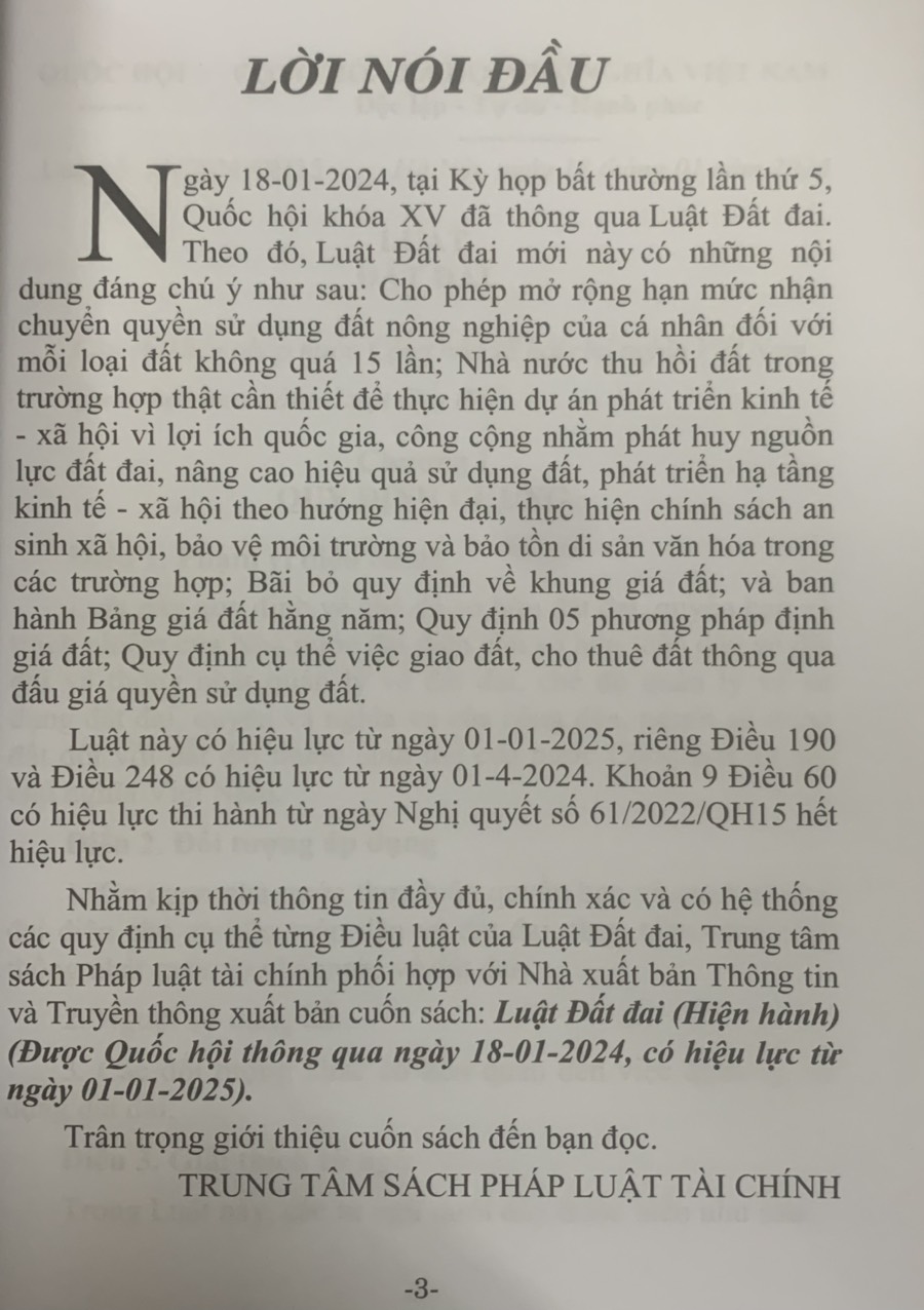 Luật Đất đai (sửa đổi, bổ sung năm 2024) và các văn bản hướng dẫn thi hành Tác giả: Quốc Hội Nhà xuất bản: Lao Động Công ty phát hành: Nhà sách Tư Pháp Ngày