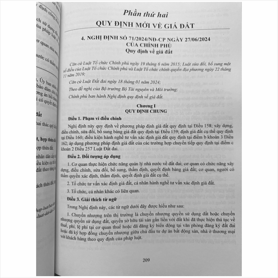- Toàn bộ sách bìa mềm khổ lớn 20 x 28 cm phân phối bởi Nhà sách Nam Việt đều được bọc sách Plastic MIỄN PHÍ và xuất hóa đơn điện tử đầy đủ, nhanh chóng. …//… Lời giới thiệu: Luật Đất đai số 31/2024/QH15 đã được Quốc hội khóa XV thông qua ngày 18/01/2024. Luật Đất đai số 31/2024/QH15 gồm 16 chương, 260 điều, trong đó sửa đổi, bổ sung 180/212 điều của Luật Đất đai năm 2013 và bổ sung mới 78 điều. Để sớm đưa Luật Đất đai vào cuộc sống, phù hợp với chủ trương của Đảng, khắc phục những tồn tại, hạn chế, nhất là trong công tác định giá đất, thu hồi đất, bồi thường, hỗ trợ tái định cư, ngày 29/6/2024 Quốc hội đã thông qua Luật sửa đổi, bổ sung một số điều của Luật Đất đai số 31/2024/QH15, Luật Nhà ở số 27/2023/QH15, Luật Kinh doanh bất động sản số 29/2023/QH15, Luật Các tổ chức tín dụng số 32/2024/QH15. Ngoài ra trong sách đã cập nhật các Nghị định mới trong năm 2024 như sau: – Nghị định số 71/2024/NĐ-CP ngày 27/6/2024 Quy định về giá đất – Nghị định số 88/2024/NĐ-CP ngày 15/7/2024 Quy định về bồi thường, hỗ trợ, tái định cư khi nahf nước thu hồi đất – Nghị định 101/2024/NĐ-CP ngày 29/7/2024 Quy định về điều tra cơ bản đất đai; đăng ký, cấp giấy chứng nhận quyền sử dụng đất, quyền sở hữu tài sản gắn liền với đất và hệ thống thông tin đất đai – Nghị định 102/2024/NĐ-CP ngày 30/7/2024 Quy định chi tiết thi hành một số điều của Luật Đất đai – Nghị định 103/2024/NĐ-CP ngày 30/7/2024 Quy định về tiền sử dụng đất, tiền thuê đất – Nghị định 104/2024/NĐ-CP ngày 31/7/2024 Quy định quỹ phát triển đất