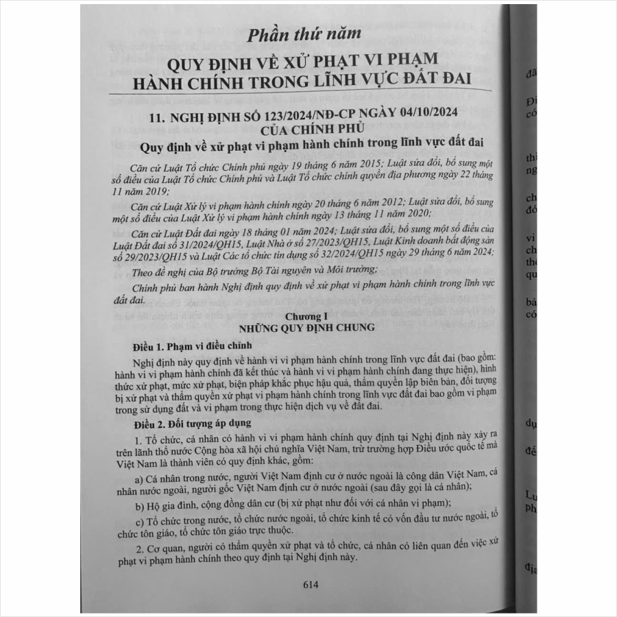 - Nghị định số 123/2024/NĐ-CP ngày 04/10/2024 Quy định về xử phạt vi phạm hành chính trong lĩnh vực đất đai Để giúp bạn đọc thuận tiện tra cứu, tham khảo Luật Đất đai, Luật sửa đổi, bổ sung một số điều của Luật Đất đai số 31/2024/QH15, và các nghị định hướng dẫn thi hành mới nhất, Nhà sách Nam Việt xin trân trọng giới thiệu cuốn sách: Luật Đất Đai (sửa đổi, bổ sung 2024) – Và Các Văn Bản Hướng Dẫn Thi Hành Về Giá Đất, Bồi Thường, Hỗ Trợ, Tái Định Cư Khi Nhà Nước Thu Hồi Đất …//… Nội dung cuốn sách gồm các phần chính sau: Phần thứ nhất. LUẬT ĐẤT ĐAI 2024 Phần thứ hai. QUY ĐỊNH MỚI VỀ GIÁ ĐẤT Phần thứ ba. QUY ĐỊNH VỀ BỒI THƯỜNG, HỖ TRỢ, TÁI ĐỊNH CƯ KHI NHÀ NƯỚC THU HỒI ĐẤT Phần thứ tư. QUY ĐỊNH VỀ CHO THUÊ ĐẤT, ĐĂNG KÝ, CẤP GIẤY CHỨNG NHẬN QUYỀN SỬ DỤNG ĐẤT, QUYỀN SỞ HỮU TÀI SẢN GẮN LIỀN VỚI ĐẤT *** Quý khách hàng hãy an tâm khi mua sách tại Nhà sách Nam Việt, cam kết uy tín, chất lượng, sách bản gốc chuẩn đẹp, được kiểm hàng, hài lòng mới thanh toán, sách đã được bọc plastic cao cấp miễn phí! …//… Cảm ơn các bạn đã ghé thăm shop Nhà sách Nam Việt ! Sách Luật Đất Đai (sửa đổi, bổ sung 2024) – Và Các Văn Bản Hướng Dẫn Thi Hành Về Giá Đất, Bồi Thường, Hỗ Trợ, Tái Định Cư Khi Nhà Nước Thu Hồi Đất Sách Luật Đất Đai (sửa đổi, bổ sung 2024) – Và Các Văn Bản Hướng Dẫn Thi Hành Về Giá Đất, Bồi Thường, Hỗ Trợ, Tái Định Cư Khi Nhà Nước Thu Hồi Đất
