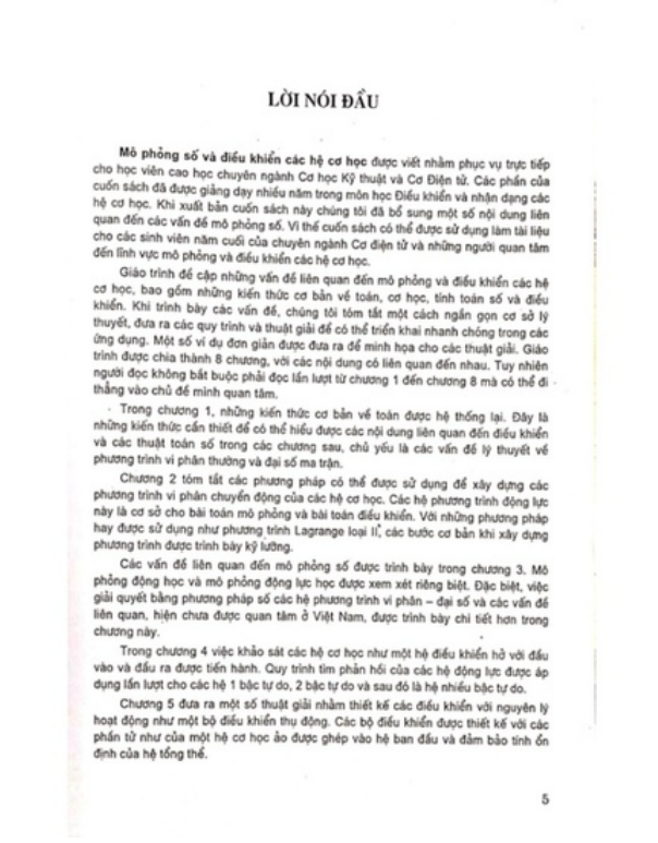 Giáo trình đề cập những vấn đề liên quan đến mô phỏng và điều khiển các hệ cơ học, bao gồm những kiến thức cơ bản về toán, cơ học, tính toán số và điều khiển. Khi trình bày các vấn đề, chúng tôi tóm tắt một cách ngắn gọn cơ sở lý thuyết, đưa ra các quy trình và thuật giải để có thể triển khai nhanh chóng trong các ứng dụng. Một số ví dụ đơn giản được đưa ra để minh họa cho các thuật giải. Giáo trình được chia thành 8 chương, với các nội dung có liên quan đến nhau. Tuy nhiên người đọc không bắt buộc phải đọc lần lượt từ chương 1 đến chương 8 mà có thể đi thẳng vào chủ đề minh quan tâm.