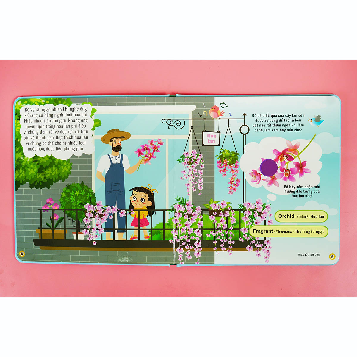 Điểm độc đáo của Sách mùi hương nằm ở các tem mùi hương được gắn kèm trong mỗi trang sách. Trẻ và bố mẹ có thể chà sát nhẹ tem mùi hương để ngửi mùi hương của các loại hoa và quả.