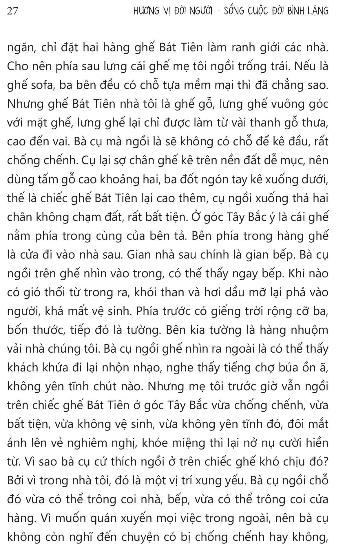 Là một tác phẩm ra đời khi tác giả đã rời bỏ chốn đô hội “lao xao” nhộn nhịp để về quê an lạc. Trong quãng thời gian đó, ông rút ra nhiều chiêm nghiệm về nhân sinh quan và đúc kết chúng lại thành những “hương vị” của cuộc sống. 40 bài tản văn được ông chia làm 5 loại hương vị: đời người, thời gian, cô đơn, nghệ thuật, cuộc sống.