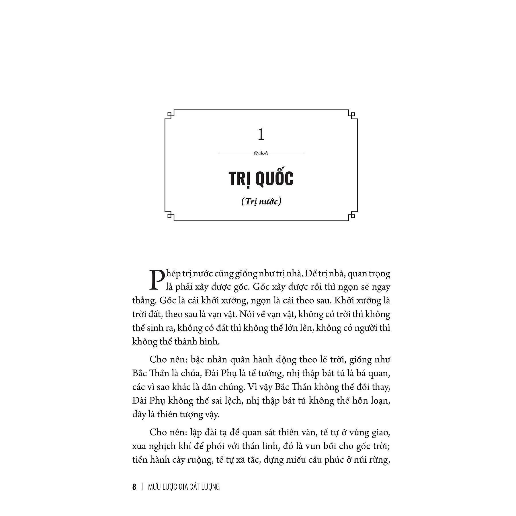 Mưu Lược Trung Hoa - Phần 2. MƯU LƯỢC GIA CÁT LƯỢNG Gia Cát Lượng (181 - 234) tự Khổng Minh, hiệu Ngọa Long, là một nhà chính trị, nhà quân sự, nhà phát minh nổi tiếng của Trung Hoa cổ đại, là thừa tướng nước Thục Hán thời Tam quốc (220 - 280), được hậu thế xem là hình mẫu của trí tuệ và tấm lòng trung nghĩa. Gia Cát Lượng cả đời bận rộn với binh nhung, vất vả với chính trị, ra sức xây dựng và củng cố triều đình Thục Hán. Ông học rộng biết nhiều, tỉnh thông binh pháp, hành xử cẩn trọng, suy tính chu đáo. Thông qua kinh nghiệm chính trị và kinh nghiệm quân sự của chính mình, cùng với quá trình nghiên cứu trứ tác của tiến nhân, Gia Cát Lượng đã tự hình thành một hệ thống mưu lược đặc sắc, trở thành một mưu lược gia kiệt xuất trong thời loạn. Mưu Lược Trung Hoa - Phần 2. MƯU LƯỢC GIA CÁT LƯỢNGbao gồm 2 phần Phần thứ nhất: TIỆN NGHI THẬP LỤC SÁCH Trị quốc, Quân thần, Thị thính, Nạp ngôn, Sát nghi, Trị nhân, Cử thố, Khảo truất, Trị quân, Thưởng phạt, Hỷ nộ, Trị loạn, Giảo lệnh, Trảm đoạn, Tư lự, Âm sát, Phần thứ hai: TƯỚNG UYỂN Binh quyền, Trục ác, Tri nhân tính, Tướng tài, Tướng khí, Tướng tệ, Tướng chí, Tướng thiện, Tướng cương, Tướng kiêu lận, Tướng cường, Xuất sư, trạch tài, Trí dụng, Bất trận, Tướng thành, Giới bị, Tập luyện, Quân đố, Phúc tâm, Cẩn hậu, Cơ hình, Trọng hình, Thiện tướng, Thẩm nhân, Binh thế, Thắng bại, Giả quyền, Ai tử, Tam tân, Hậu ứng, Tiện lợi, Ứng cơ, Sủy năng, Khinh chiến, Địa thế, Tình thế, Kích thế, Chỉnh sư, Lệ sĩ, Tự miễn, Chiến đạo, Hòa nhân, Sát tình, Tướng tình, Uy lệnh, Đông di, Nam man, Tây nhung, Bắc địch. PHỤ LỤC