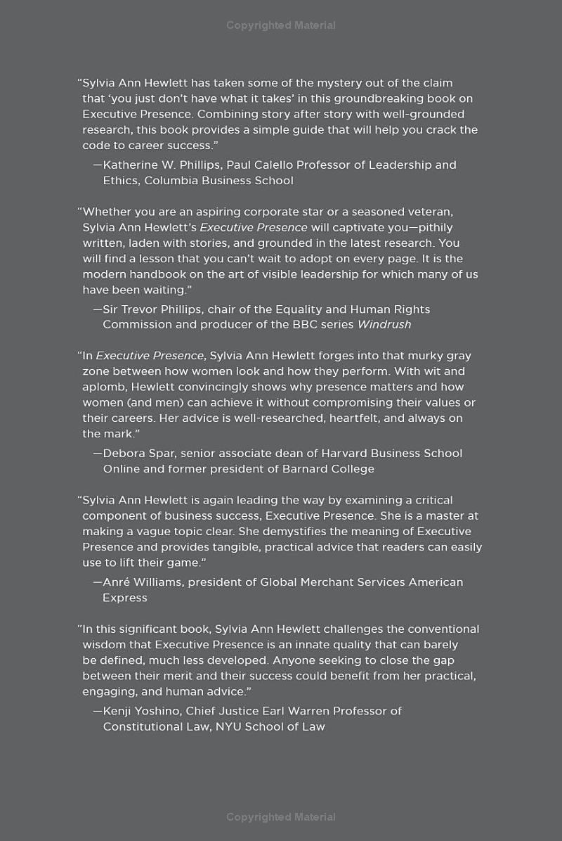 Executive Presence became a classic. Translated into seven languages, it’s helped tens of thousands of ambitious, accomplished professionals to fast-track their careers. Chuck Robbins (CEO of Cisco), and Thasunda Brown Duckett (CEO, TIAA), are among the s who recommend this book for any up-and-comer seeking to rise through the ranks and do something extraordinary with their lives.