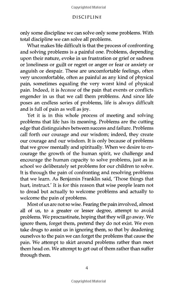 Confronting and solving problems is a painful process which most of us attempt to avoid. And the very avoidance results in greater pain and an inability to grow both mentally and spiritually. Drawing heavily on