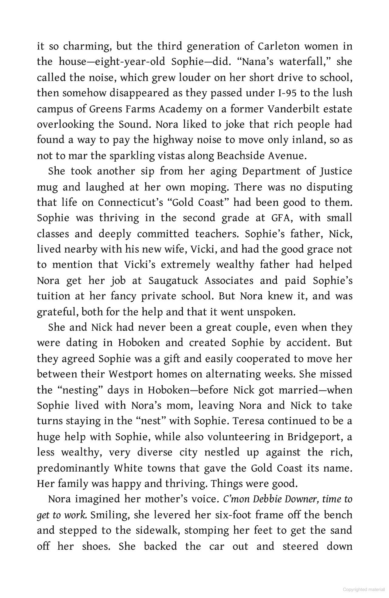 It’s been two years since Nora Carleton left the job she loved at the US Attorney’s Office to become counsel at Saugatuck Associates, the world’s largest hedge fund. The career change also meant a change of scenery, relocating her to Westport, Connecticut, fifty miles north of New York City. But it was worth it to get her daughter, Sophie, away from the city. Plus, she likes the people she works with. Especially Helen, who recruited Nora because of her skills as an investigator.