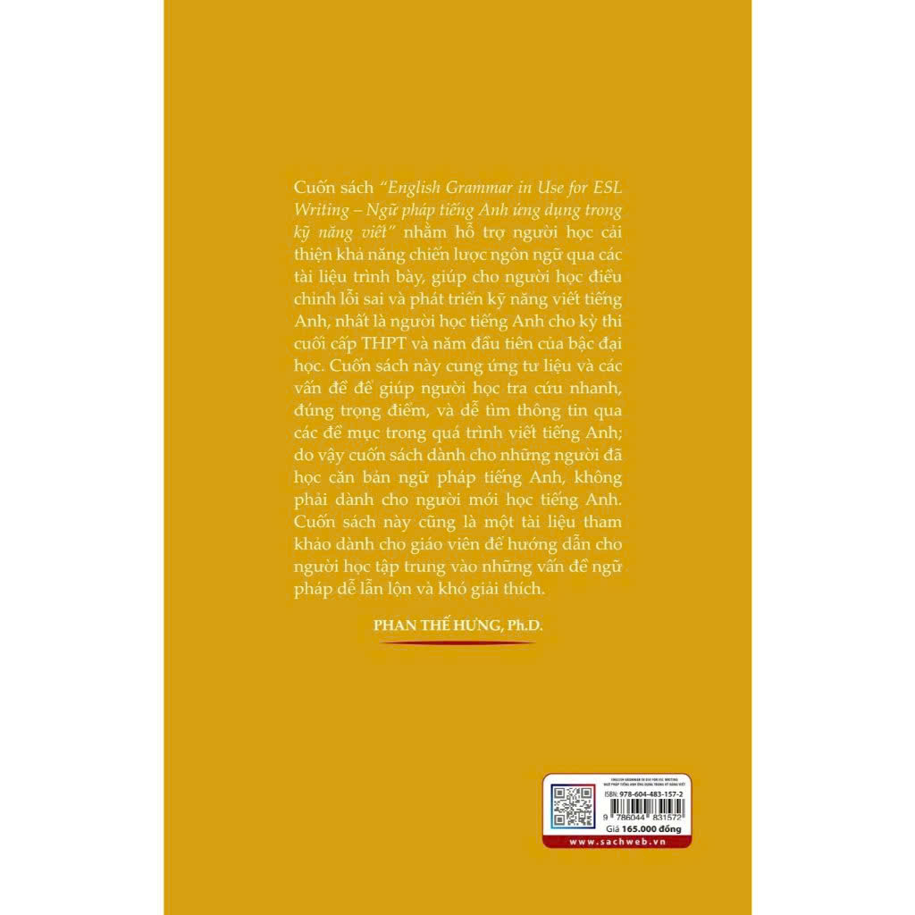 Cuốn sách “English Grammar in Use for ESL Writing – Ngữ pháp tiếng Anh ứng dụng trong kỹ năng viết” nhằm hỗ trợ người học cải thiện khả năng chiến lược ngôn ngữ qua các tài liệu trình bày, giúp cho người học điều chỉnh lỗi sai và phát triển kỹ năng viết tiếng Anh, nhất là người học tiếng Anh cho kỳ thi cuối cấp THPT và năm đầu tiên của bậc đại học. Cuốn sách này cung ứng tư liệu và các vấn đề để giúp người học tra cứu nhanh, đúng trọng điểm, và dễ tìm thông tin qua các đề mục trong quá trình viết tiếng Anh; do vậy cuốn sách dành cho những người đã học căn bản ngữ pháp tiếng Anh, không phải dành cho người mới học tiếng Anh.