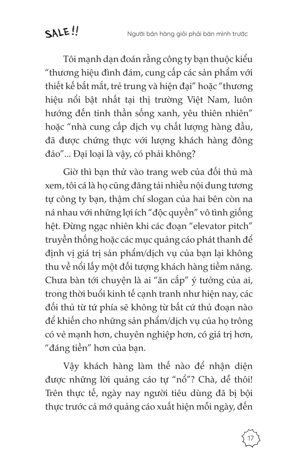 Cuốn sách nhấn mạnh tầm quan trọng của việc "bán m.ình" trước khi bán sản phẩm. Khách hàng không chỉ mua sản phẩm, mà còn mua cả con người và sự tin tưởng. Việc "bán m.ình" là quá trình xây dựng niềm tin và mối quan hệ vững chắc với khách hàng, giúp bạn tạo được sự khác biệt và chiếm được lòng tin của khách hàng. Thông qua việc "bán m.ình", bạn sẽ làm cho khách hàng cảm thấy được tôn trọng, được lắng nghe và thấu hiểu, từ đó tăng khả năng chốt đơn và tạo dựng mối quan hệ lâu dài với họ.